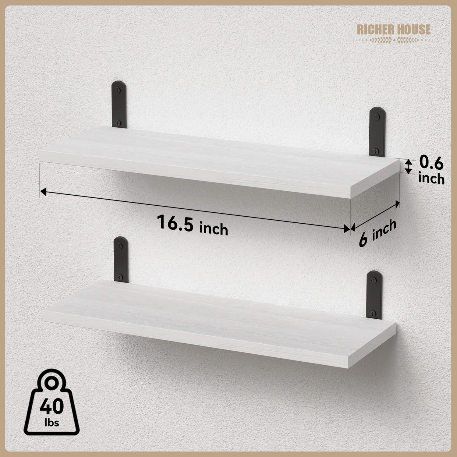 - Enhance Your Space with Ample Storage:Our set of 2 floating shelves (16.5"L×5.7"W×0.6"H) offers ample storage. With a maximum weight capacity of 40 lb, RICHER HOUSE Floating Shelves are ideal for bathrooms, bedrooms, kitchens, and living rooms. Add a touch of farmhouse rustic charm to your walls and home effortlessly.