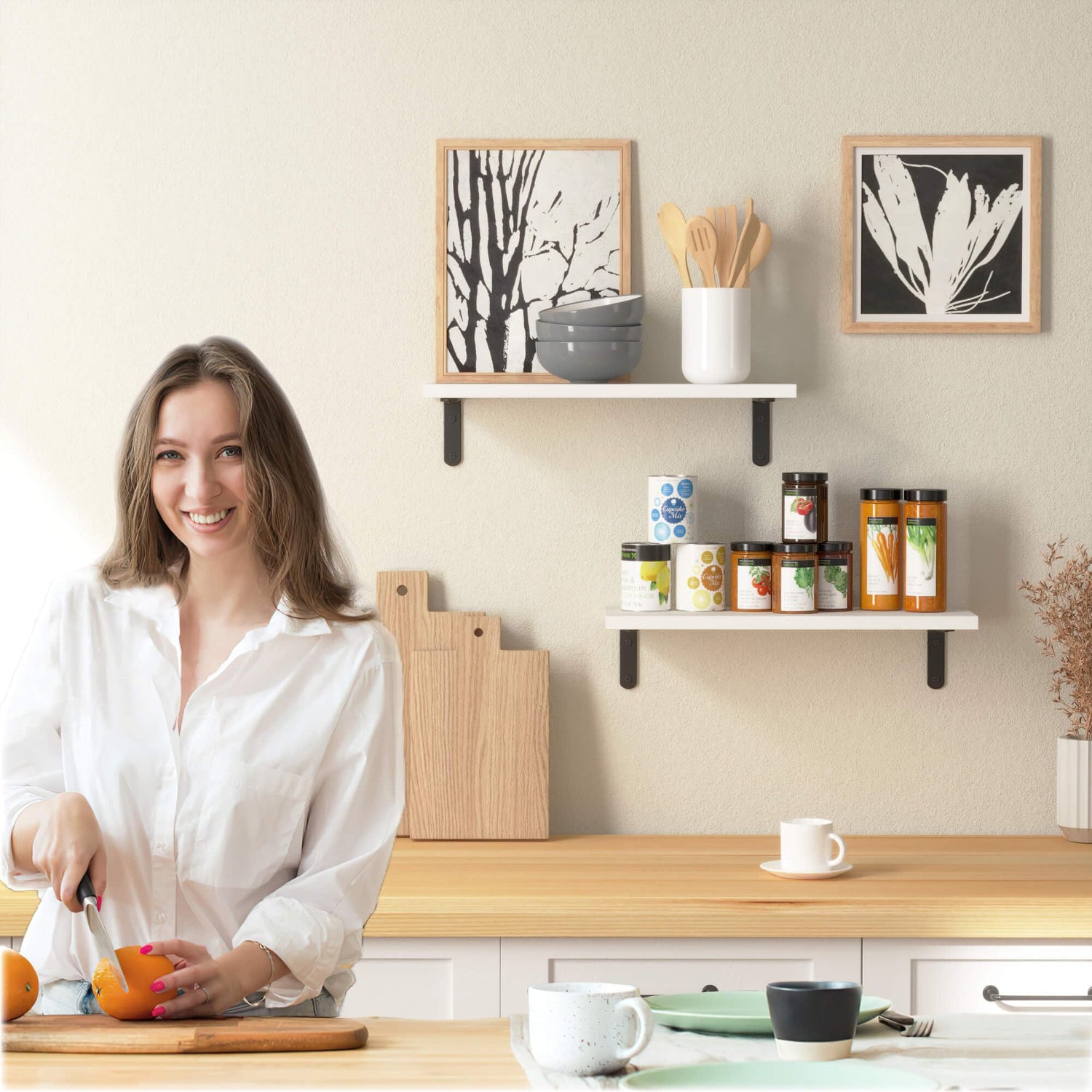 - Easy Install, Instant Style: With 2 wall floating shelf boards and 4 shelf brackets, RICHER HOUSE Floating Wall Shelf makes DIY décor a breeze. No pre-drilled holes needed. Versatile metal brackets can be mounted on top or bottom, transforming them into wall décor, bathroom, bedroom, kitchen, or plant shelves. Customize your wall space effortlessly.