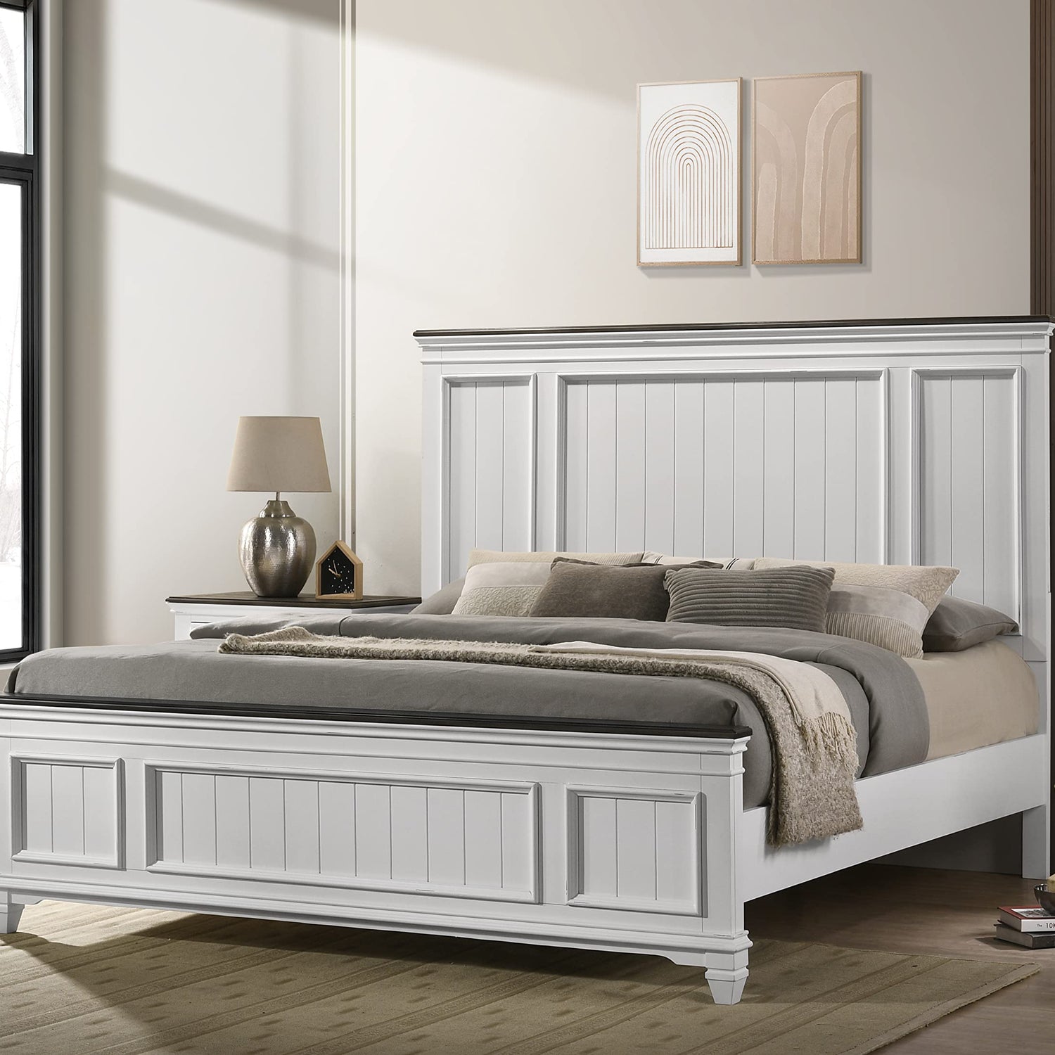 Roundhill Furniture Clelane Shiplap Wood Panel Bed, King, Weathered White and Walnut