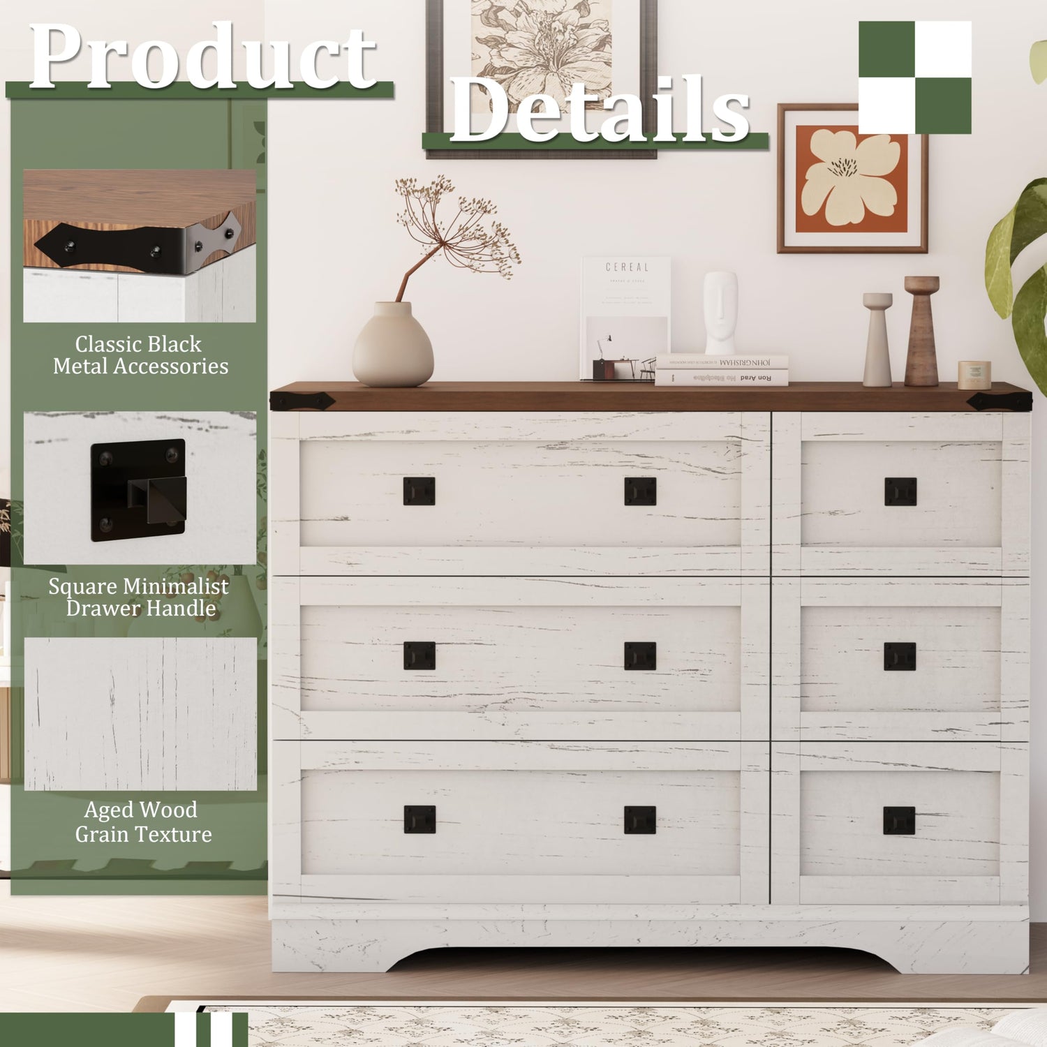 Royal Windsor Farmhouse 6 Drawer Dresser for Bedroom, Chest of Drawers Dresser for Closet, Clothes Organizers and Storage with Spacious Tabletop, Wooden Dressers for Living Room, White