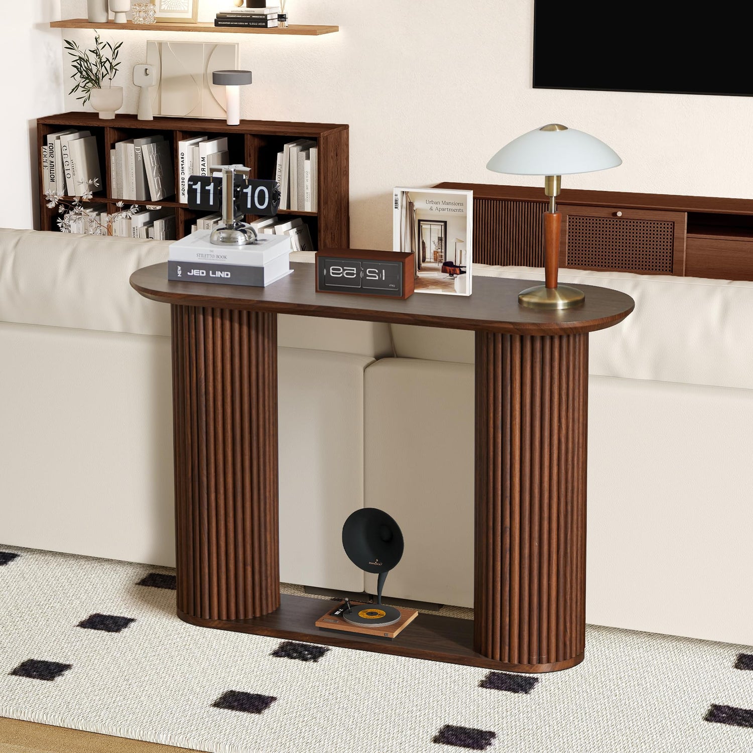 RUSTYER Fluted Console Table, Farmhouse Oval Curved Entryway Table with Storage and Fluted Wood Legs, Narrow Small Long Entry Sofa Table for Entrance, Hallway, Living Room (Walnut)