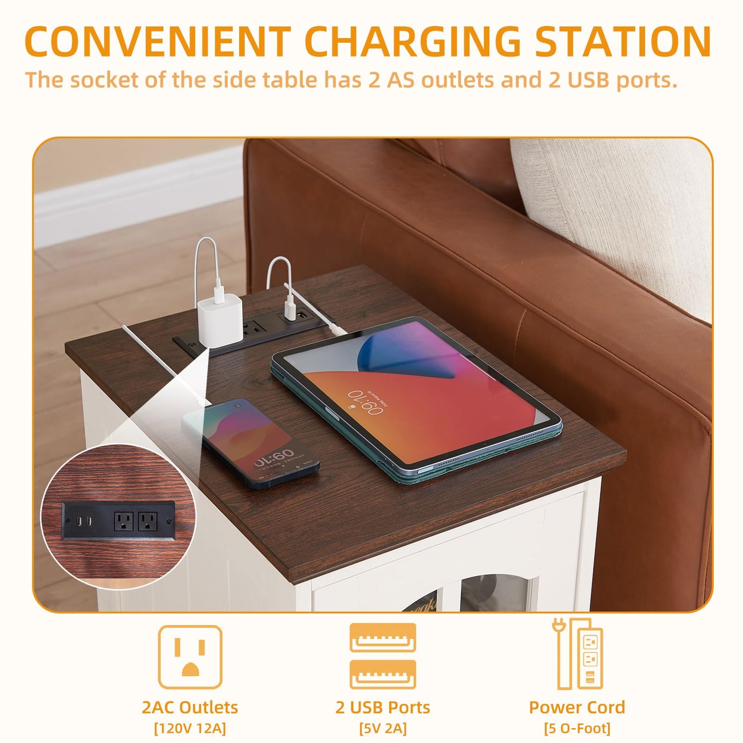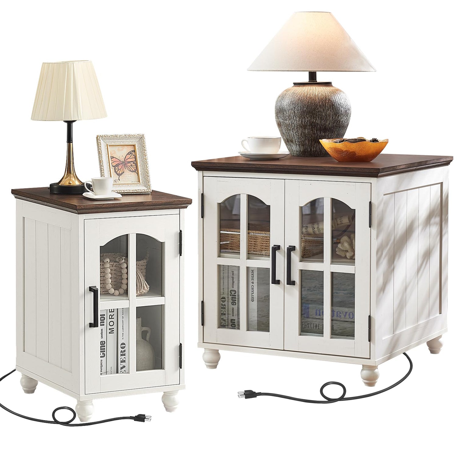RWYHG Farmhouse End Table Set of 2 with Charging Station, 18'' Narrow Side Table and 24" Large Sofa Side Table with Glass Barn Door Storage, Wood Night Stand Bedside Table for Living Room,Bedroom
