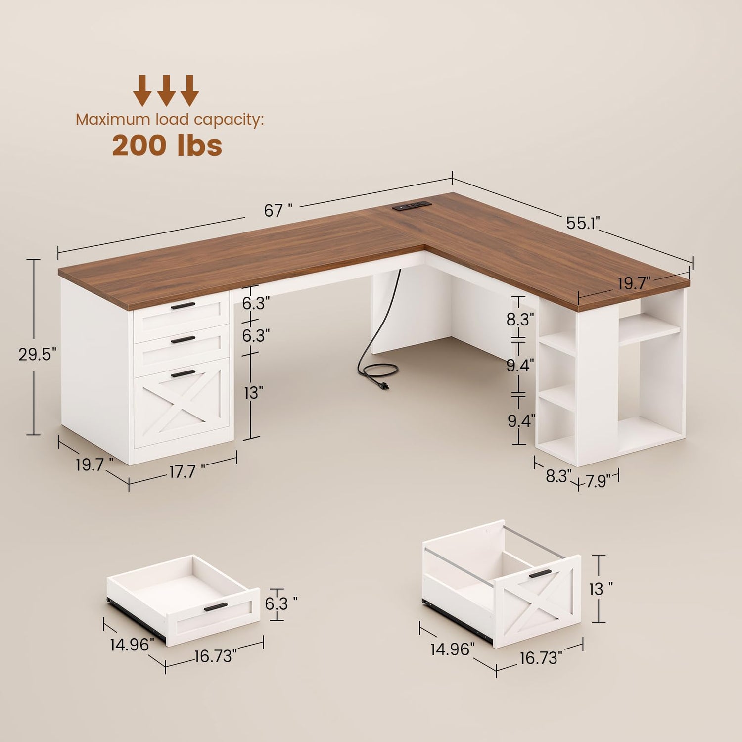SEDETA Farmhouse 67" L Shaped Desk with 3 Drawers, White Corner Computer Desk with Storage Shelves, Home Office Desks with Power Outlets,Executive Desk for Home Office, White and Brown