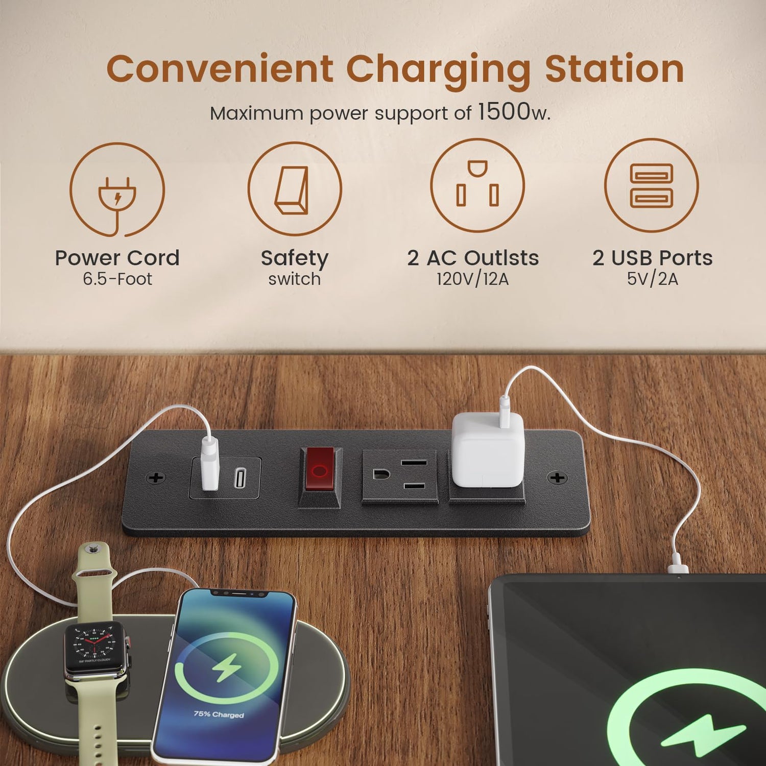 - 【Charging Port】Our charging station includes 2-Outlet & 2 USB Ports to provide power for up to 4 devices simultaneously. Also includes an on-off switch, thanks to the on-off switch, one-button power off to ensure safe electricity use, which strengthens security. Power outlet allows you to charge cell phones, tablets, notebooks, etc.