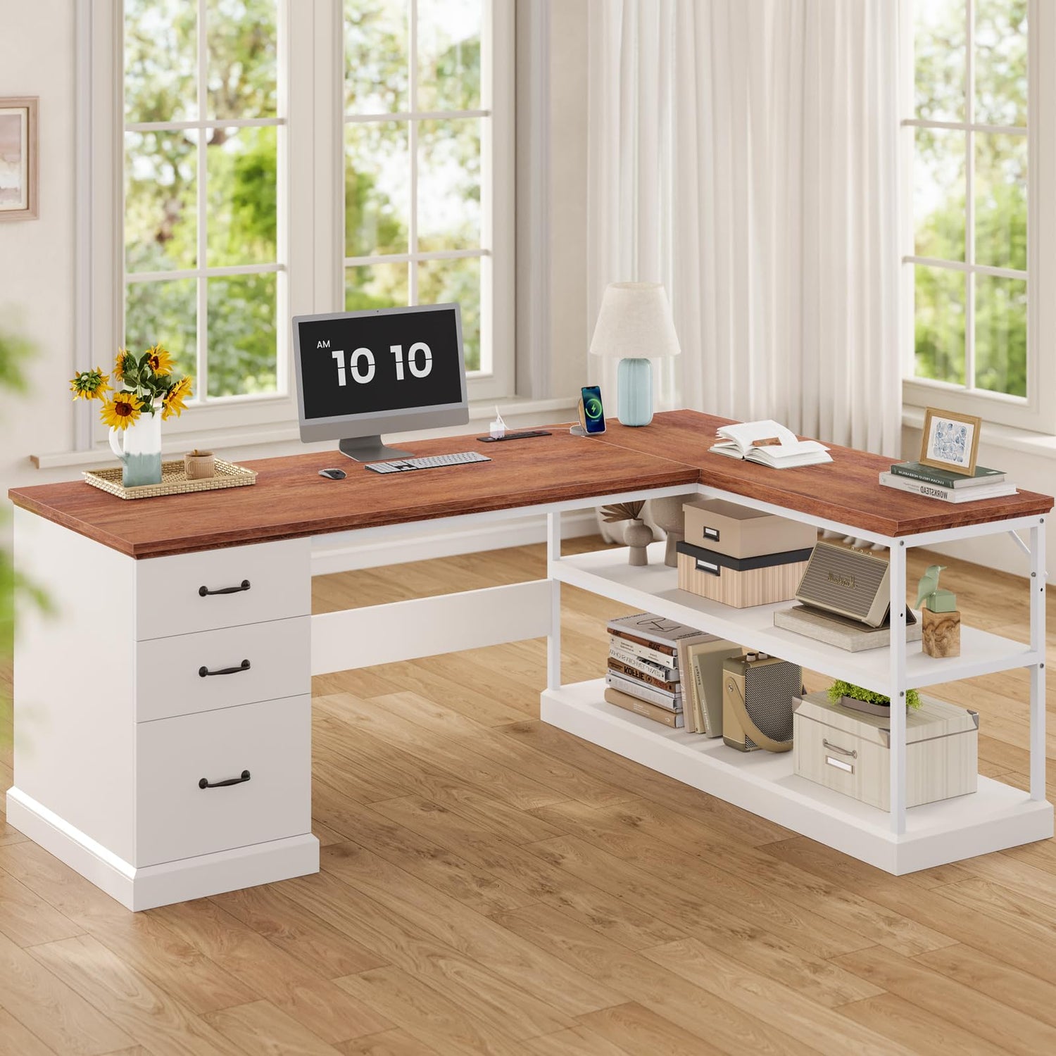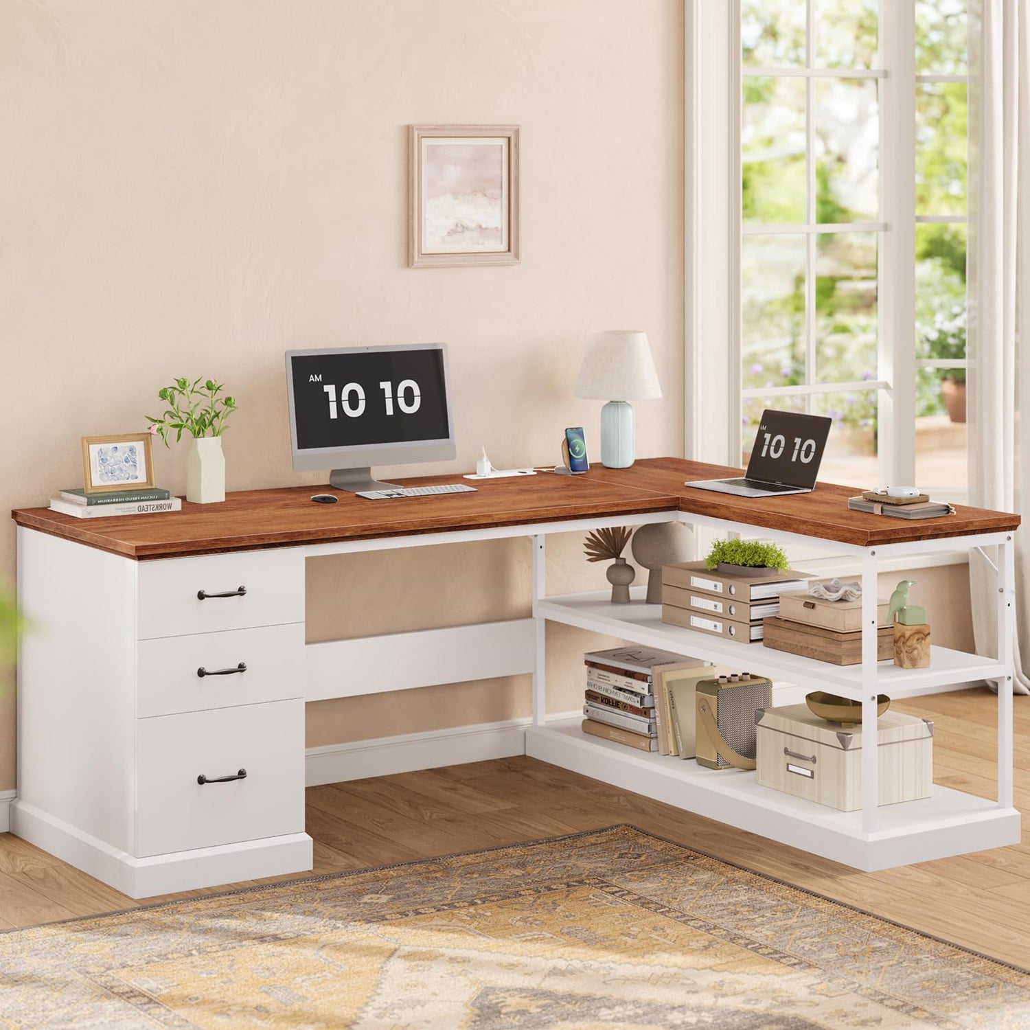 SEDETA L Shaped Desk, Farmhouse Desk with Drawers and Storage Shelves, Executive Home Office Desk with Power Outlet, File Cabinet Storage, Wood Corner Computer Desk, White