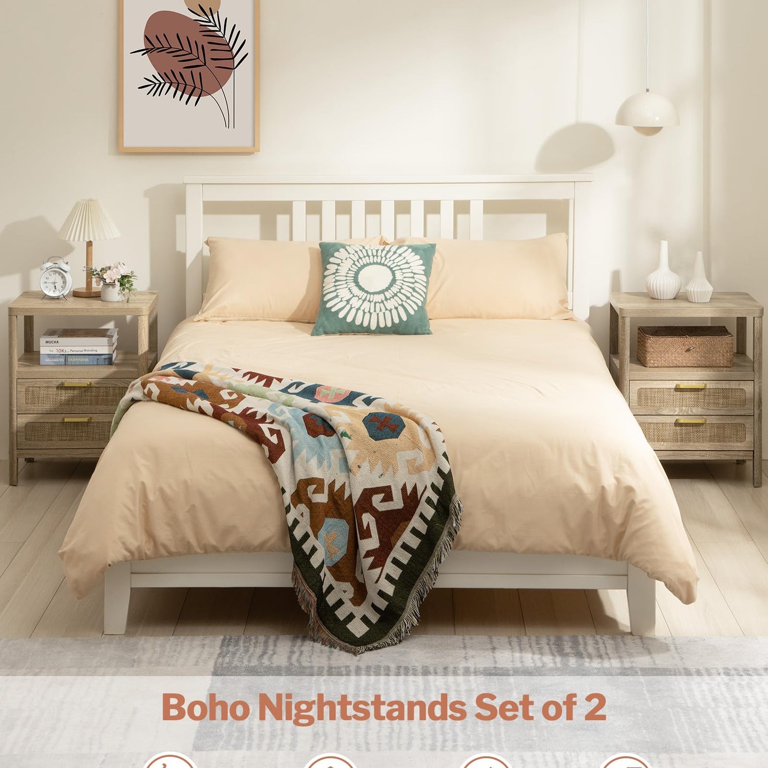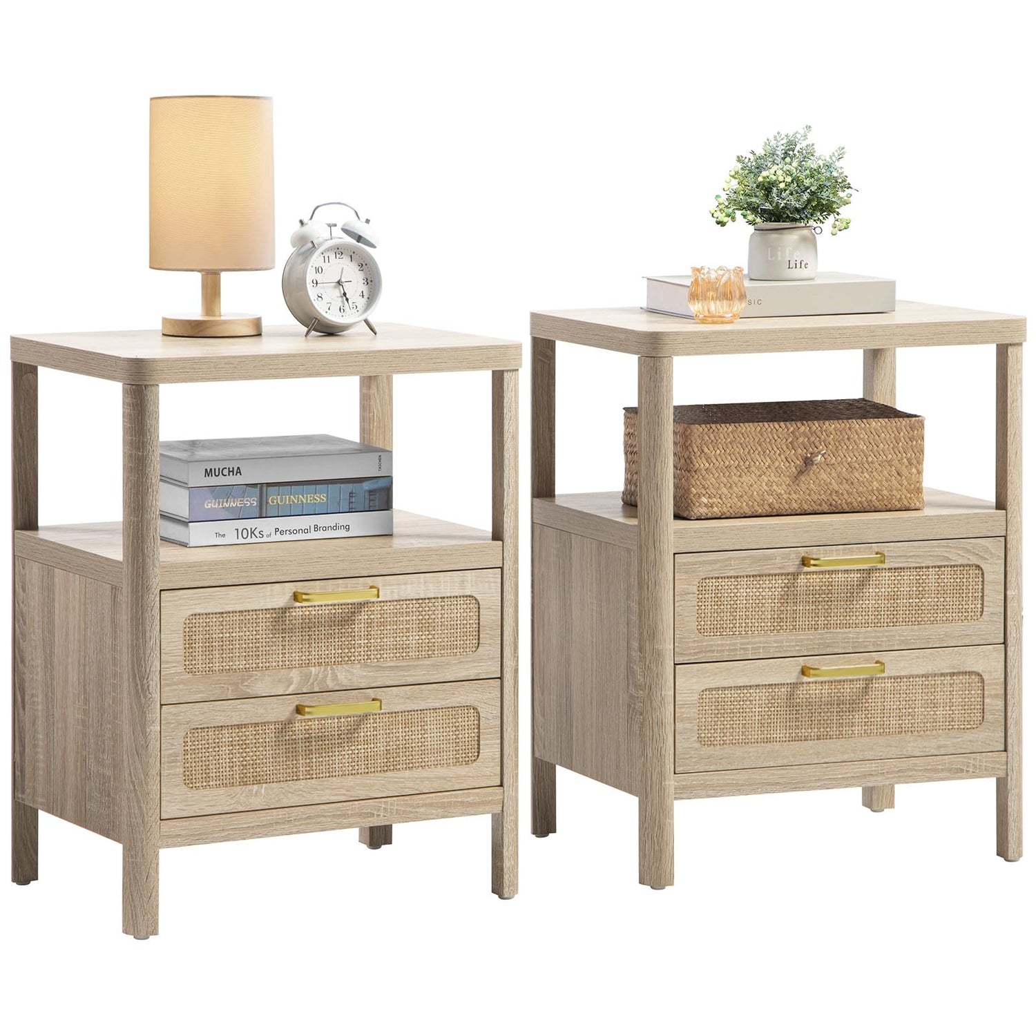 SHEEPPING Rattan Nightstands Set of 2 - Bedside Tables with 2 PE Rattan Drawers, Boho Night Stand with Open Wood Shelf, Farmhouse Bed Side Table/End Table for Bedroom Living Room, Natural, 25.5" H