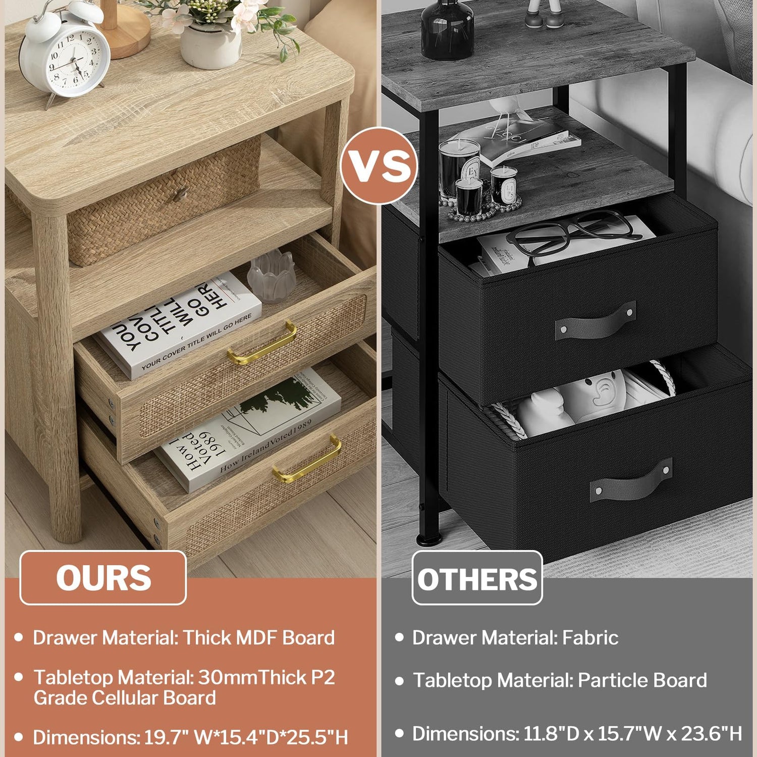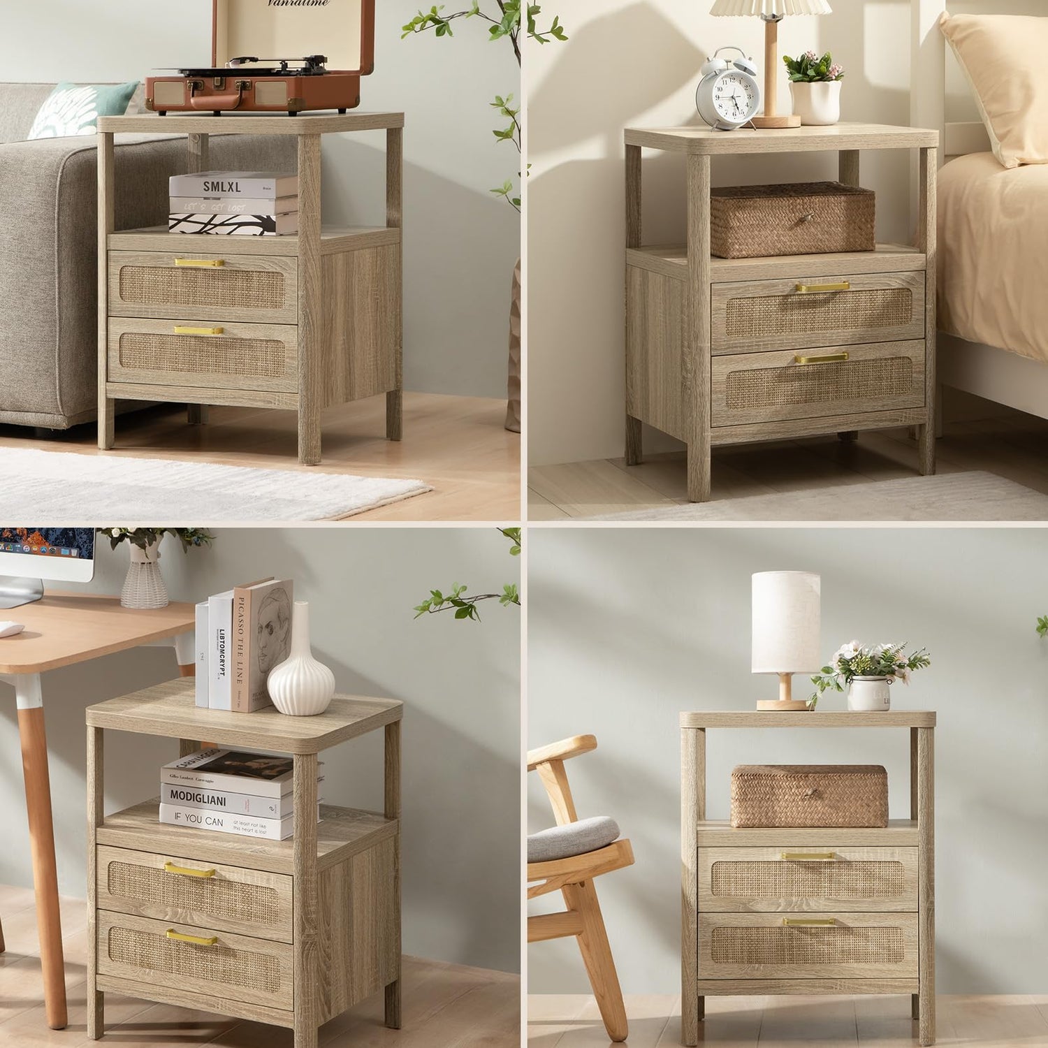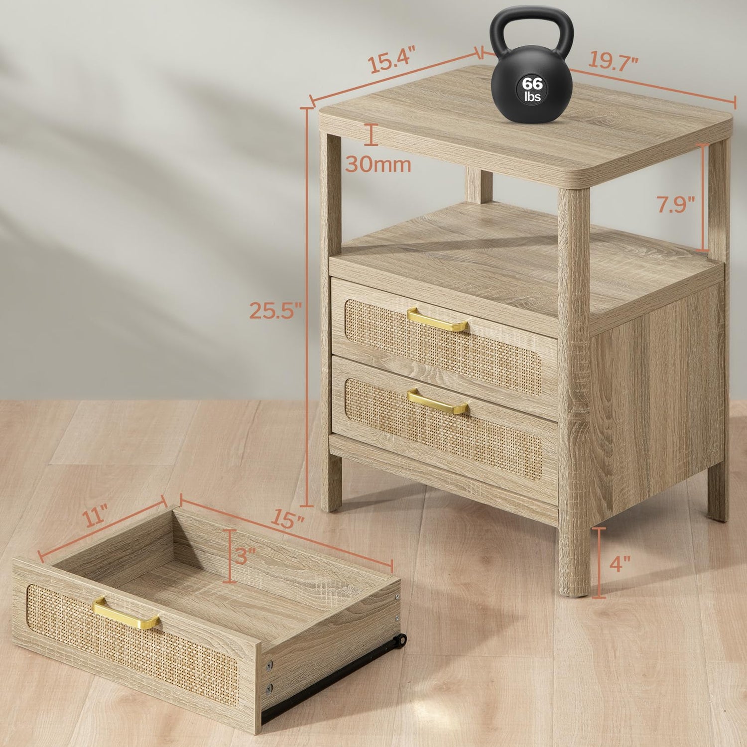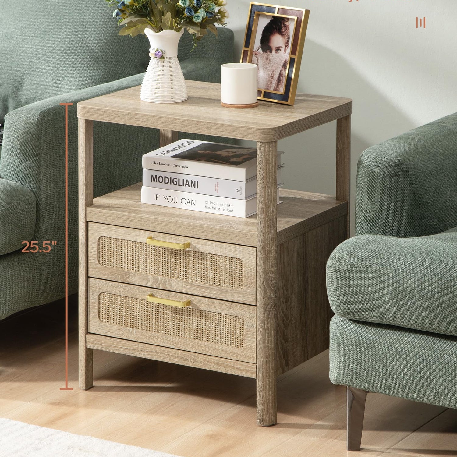 Details: Rattan Nightstand with 2 Drawers - Boho Bedside Table with Storage and Open Shelf, Tall Nightstands Farmhouse End Table, Bed Side Table/Night Stand for Bedroom, Living Room, Natural