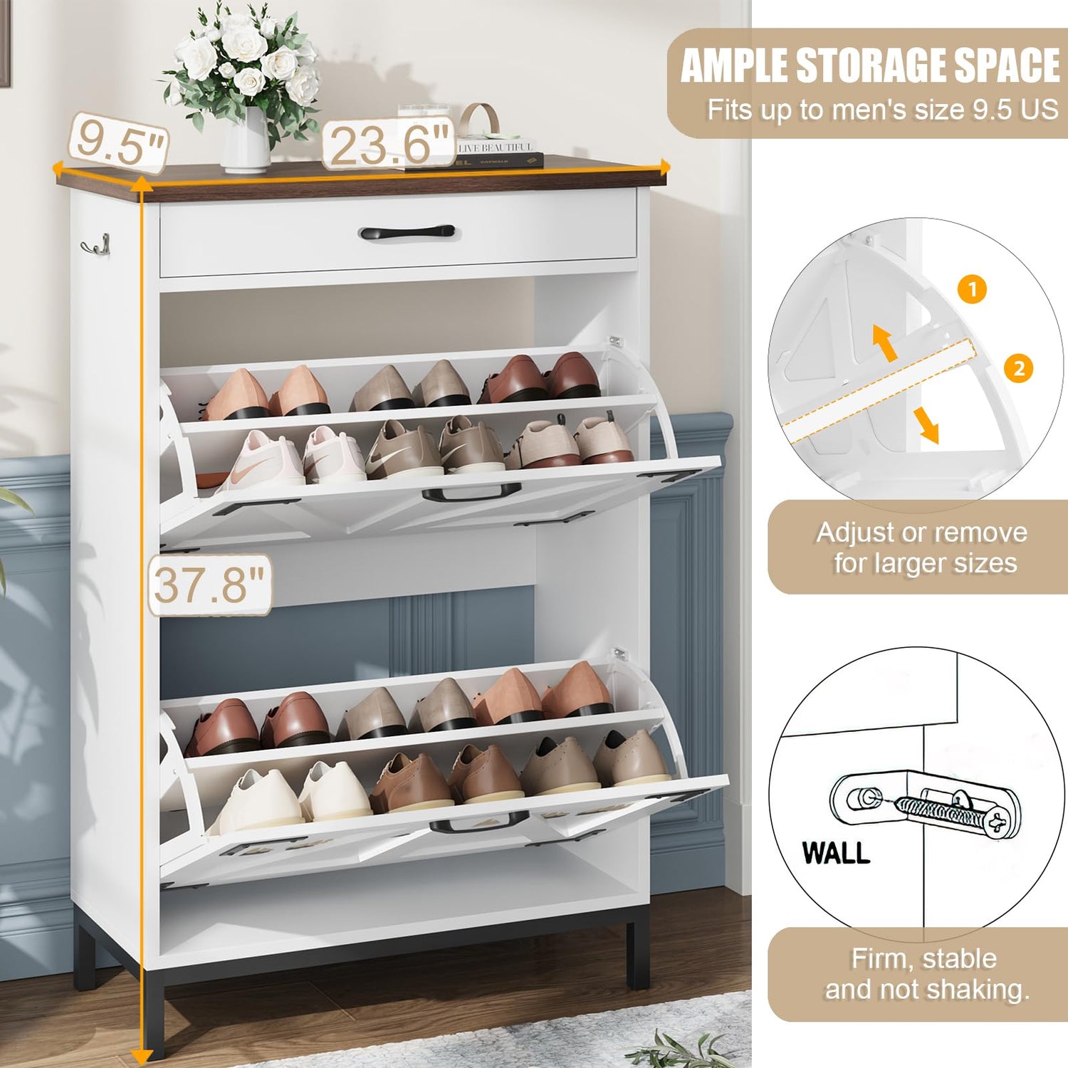 Shoe Cabinet Storage for Entryway Hidden Shoes Storage Cabinet Farmhouse Narrow Shoe Organizer Cabinet with 2 Flip Drawers, Free Standing Slim Shoe Cabinet for Door Entry, Foyer, Hallway, White