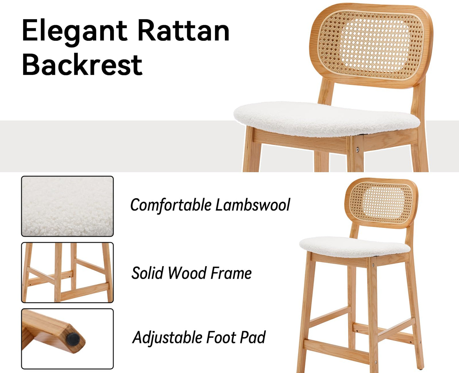 - 🕊️[Multi-function Island Stool]- These mid century modern farmhouse barstools feature comfy upholstered seats, elegant rattan back, comfortable warm lambswool and solid rubberwood legs which can be perfectly suited to kitchen counter island, dining room, living room, home bar, café, party room, country pub,or basement bar, easy to match any themes.