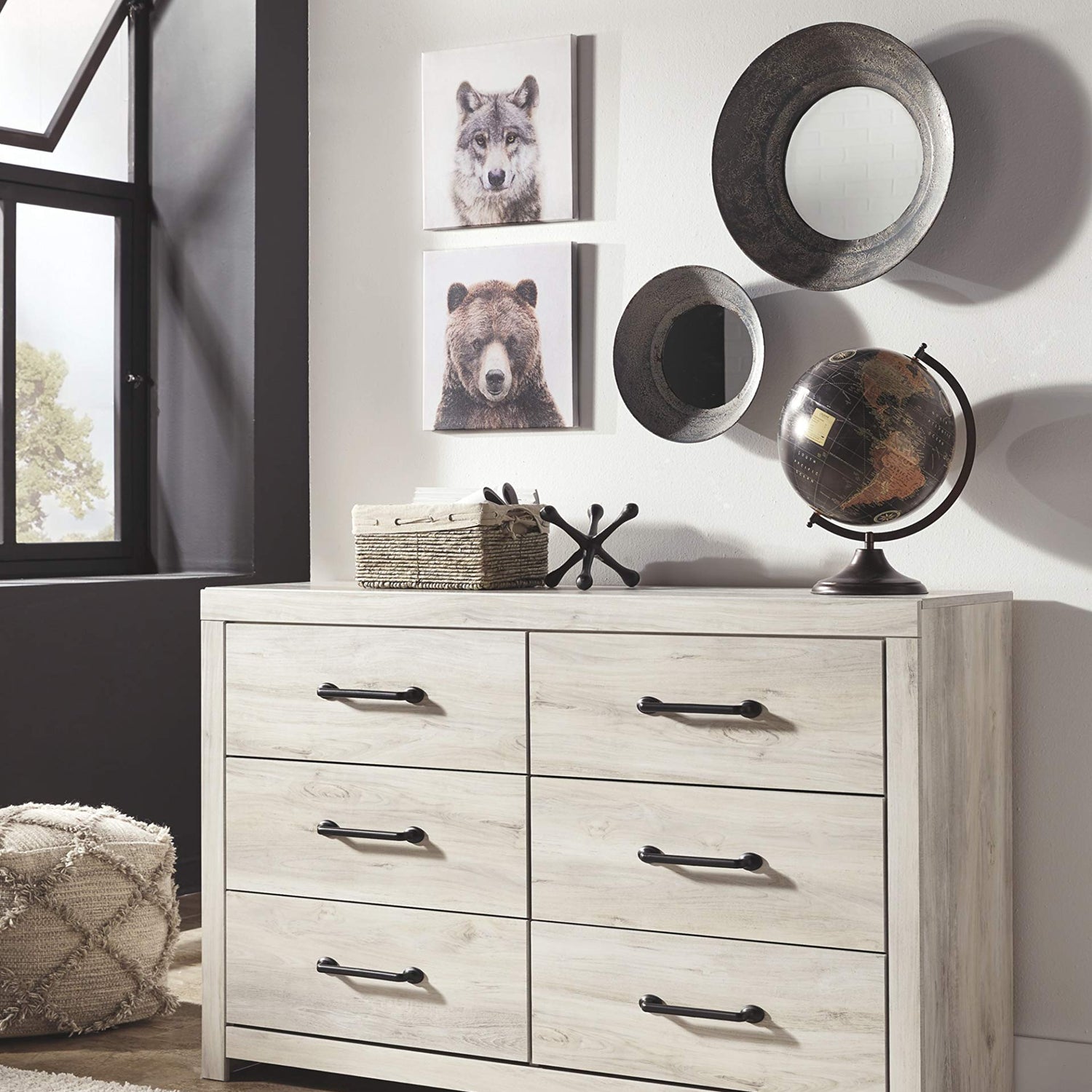 Details: What a delightful take on rustic industrial style. Whether modern loft or modern farmhouse, this dresser makes itself at home. The wispy whitewash palette enhances without covering the grain for that weathered look you crave. Elongated drawer pulls elevate the aesthetic. Whether you need storage space for clothes, linens or toys, you're sure to find the right fit. Your dream bedroom is closer than you think–our wide selection of finishes and features fulfill your decor needs, from casual to contemporary. And we go the extra mile to package, protect and deliver your purchase in a timely manner. Trust us to bring your space to life with furniture and decor that show off your style and personality.