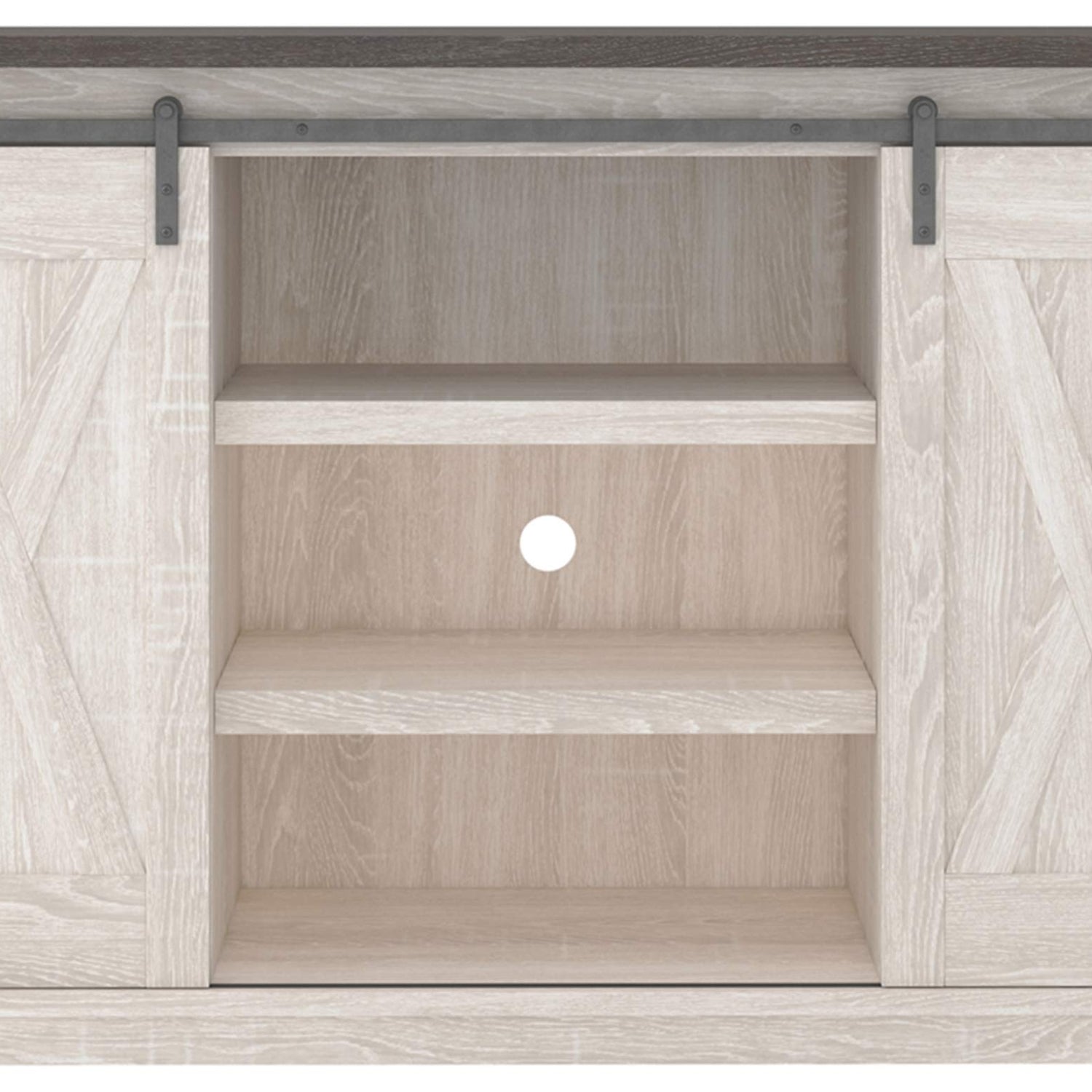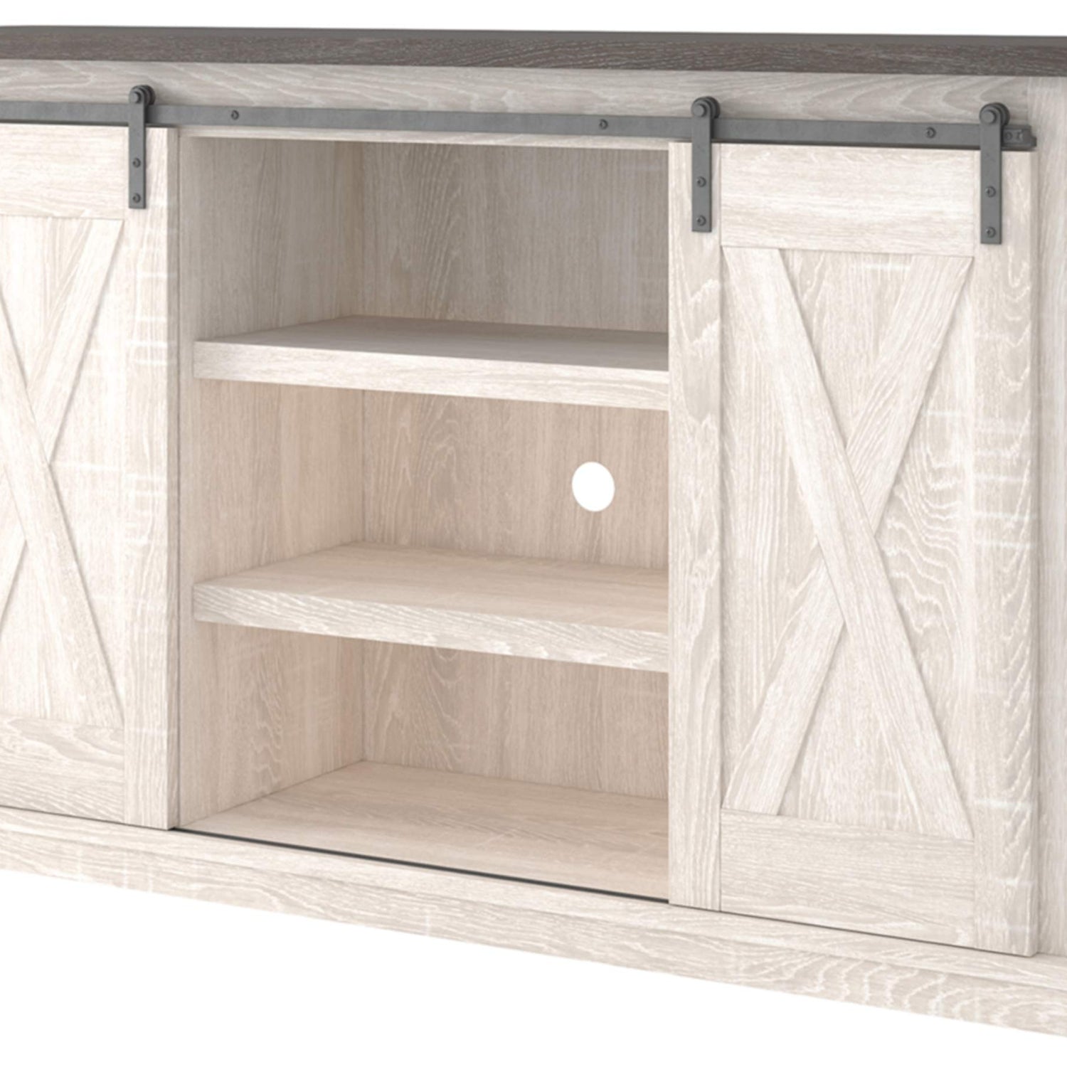 Details: With its two-tone finish, cross-buck details and authentic charm, this TV stand is right in tune with your relaxed approach to high style. Beautifully made to accommodate your media equipment, it’s well equipped with adjustable shelving, cutouts for wire management and, of course, a pair of sliding barn doors you can center or place to the side. What a mastery in modern farmhouse living. A stylish TV stand can make your entertaining space a cozy place to relax and recharge. Our entertainment centers provide sturdy support for TVs and other electronics while hiding the wires and cords that could clutter your decor. Whether you're looking for mid-century, farmhouse or other styles, our furnishings include display and storage space, with open and closed-door compartments, drawers and adjustable shelving. And we go the extra mile to package, protect and deliver your purchase in a timely manner.