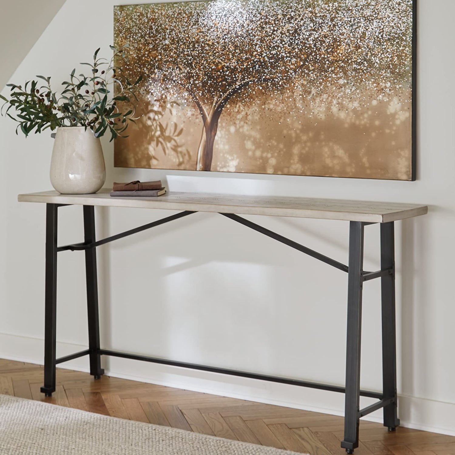 Details: Bring that trendy bar atmosphere home with this long counter-height table. Featuring an acacia veneer tabletop in a whitewashed finish and a dark metal frame for farmhouse fresh appeal, it works well against an open wall or floated behind a sofa to make the most of your living space. Customize your comfort with adjustable height swivel stools (sold separately). With a variety of styles and materials, accent tables can provide storage in a living room or give guests a spot to rest their drinks. They can add subtle drama to your decor by presenting a place for artwork, a lamp or a plant. We have a wide selection of coffee tables, console tables and occasional tables, from rustic farmhouse designs to modern openwork styles. They come in a multitude of sizes, too, so you will find one that fits just where you need it.