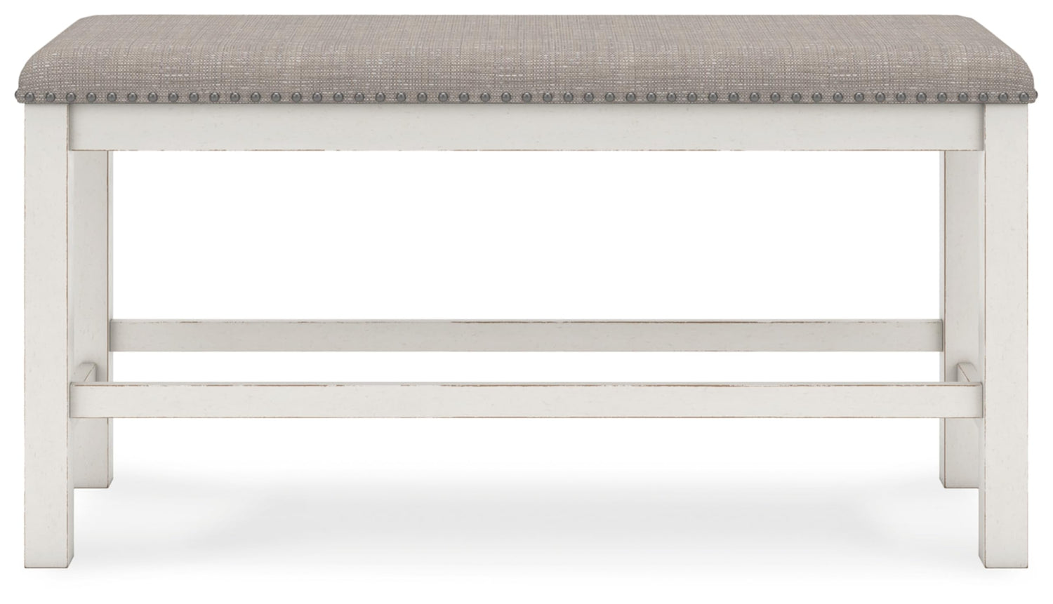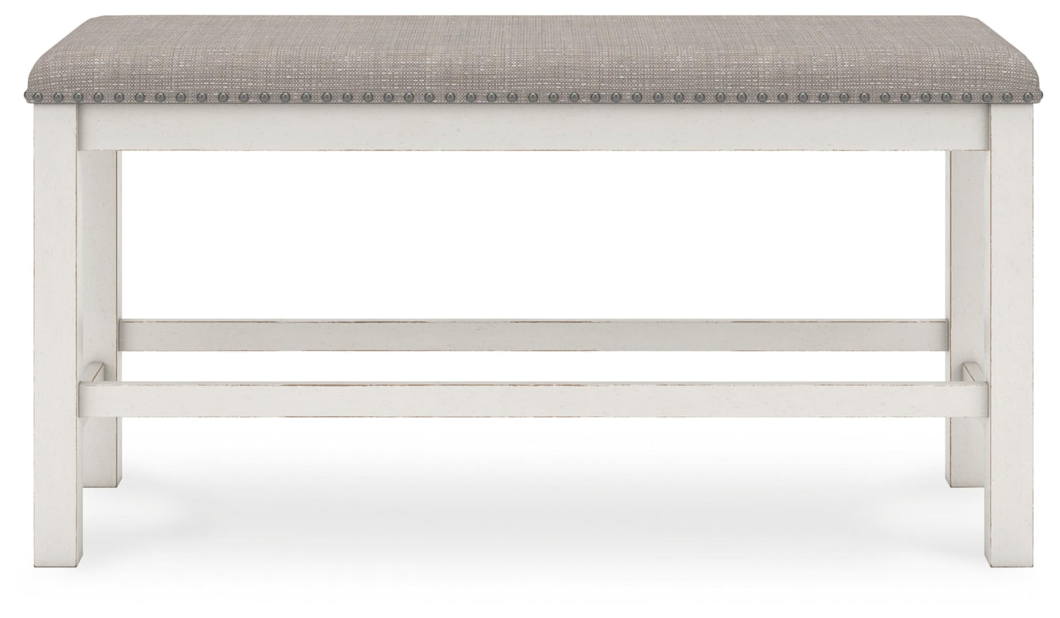 Details: This counter height dining bench is sure to impress come mealtime. With its white finish and light gray upholstery, farmhouse-style seating has never been so fashionable. All that’s missing is you and your family.