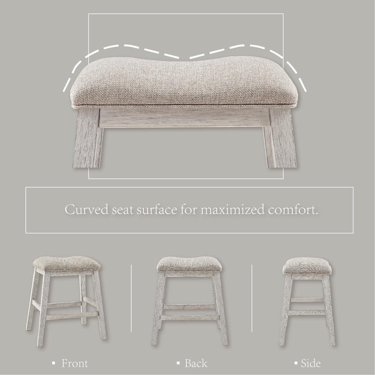 - UPHOLSTERED COUNTER STOOL: This upholstered stool invites you to raise the bar on small space living. Comfortably cushioned stools sport a grayish white finish with rub-through effect for timeworn appeal