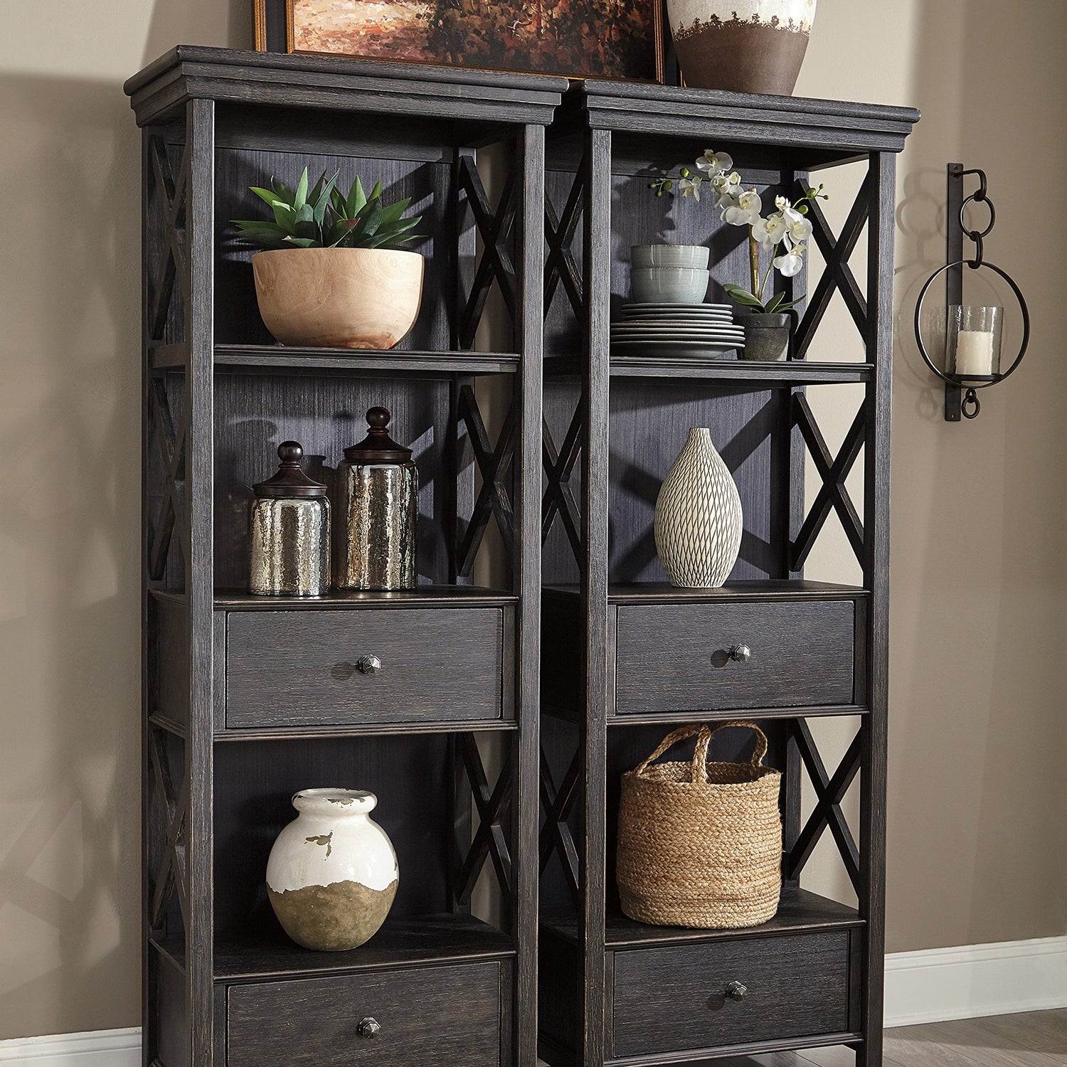 Signature Design by Ashley Tyler Creek Casual Farmhouse 75" Display Cabinet or Bookcase with Drawers and Shelf, Open Lattice Sides, Wood, Gray Black Finish