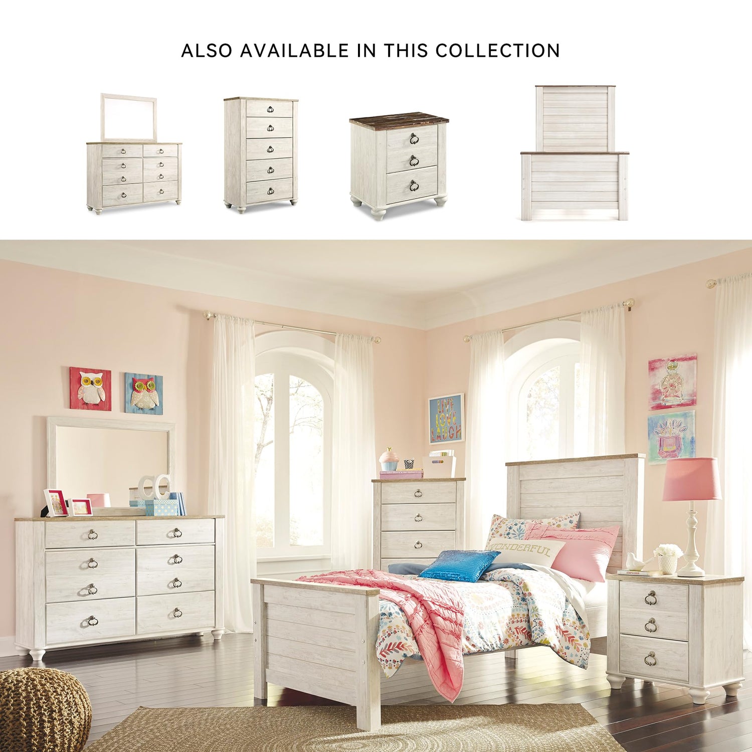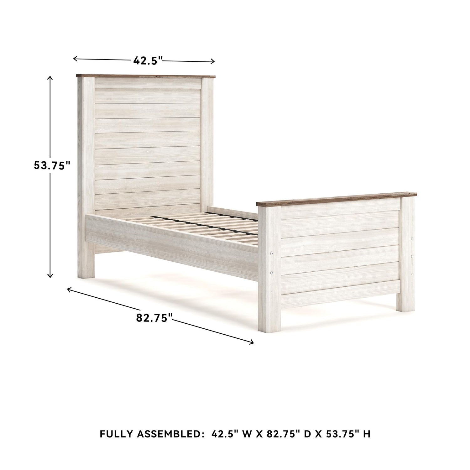 Details: The Willowton twin panel bed is the ultimate statement piece for a coastal cottage or shabby chic inspired retreat. Whitewashed finish is wonderfully easy on the eyes. Plank-style cap rails on the headboard and footboard infuse a driftwoody look that has our minds drifting away to beachy-keen escapes. Mattress and foundation/box spring available, sold separately.