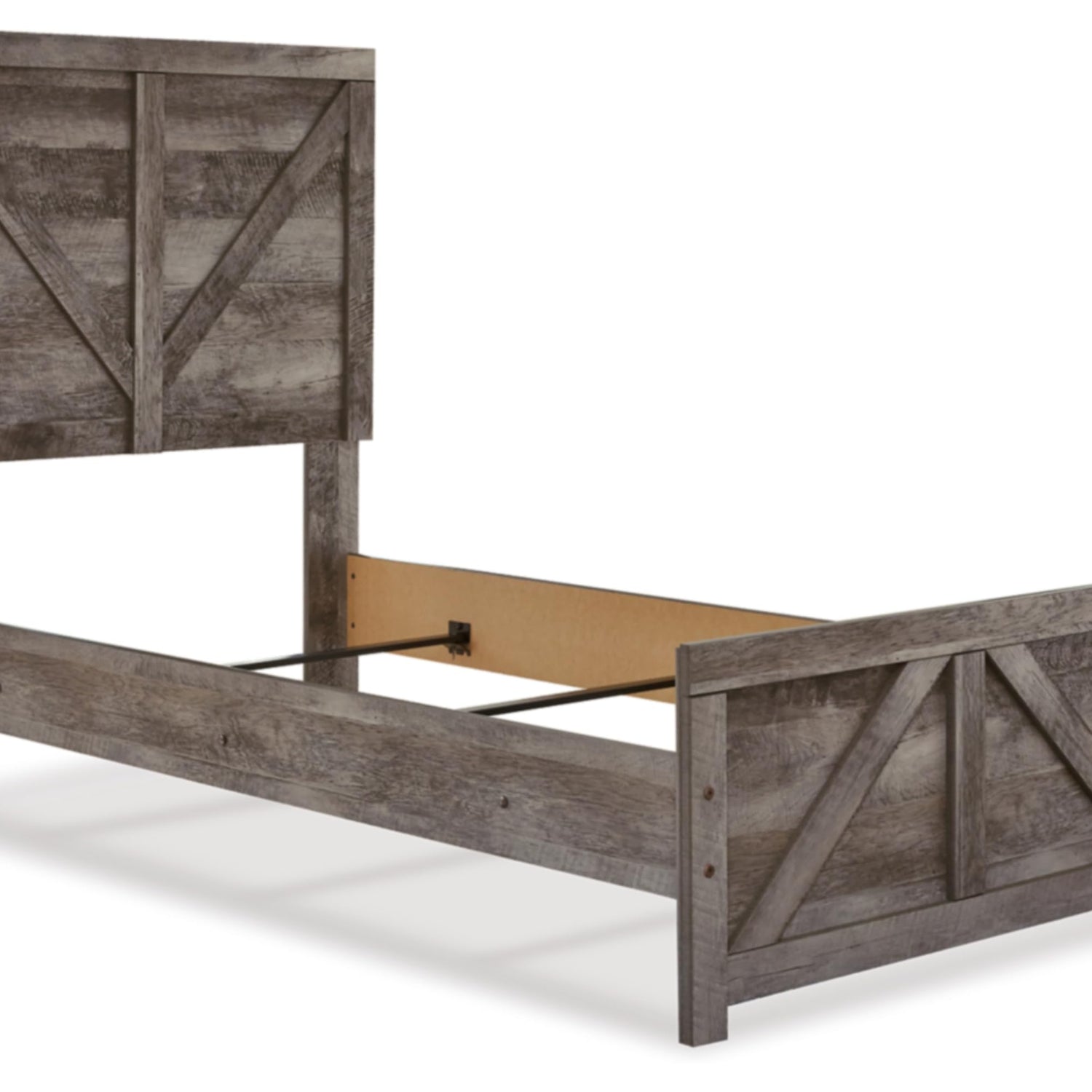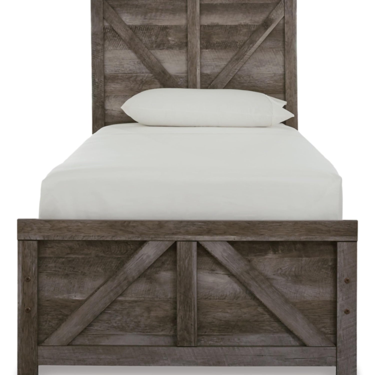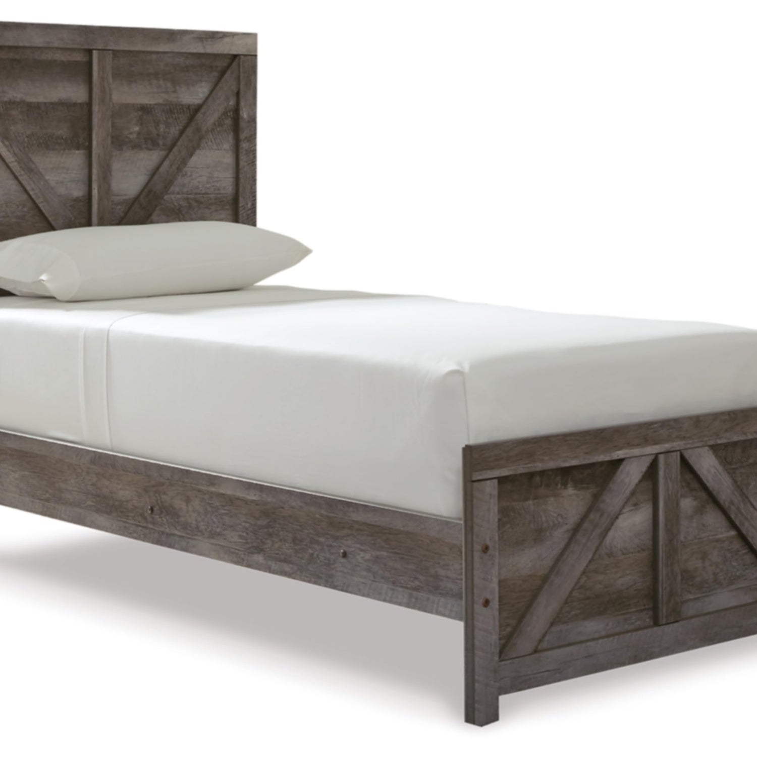 Details: The Wynnlow twin panel bed is sure to win your heart with its daring, designer take on modern rustic. The bed’s crisp, clean and minimalist-chic profile is enriched with a striking replicated oak grain with thick plank styling and a weathered gray finish for that much more authentic character. Large crossbuck design adds charming farmhouse flair. Mattress and foundation/box spring sold separately.