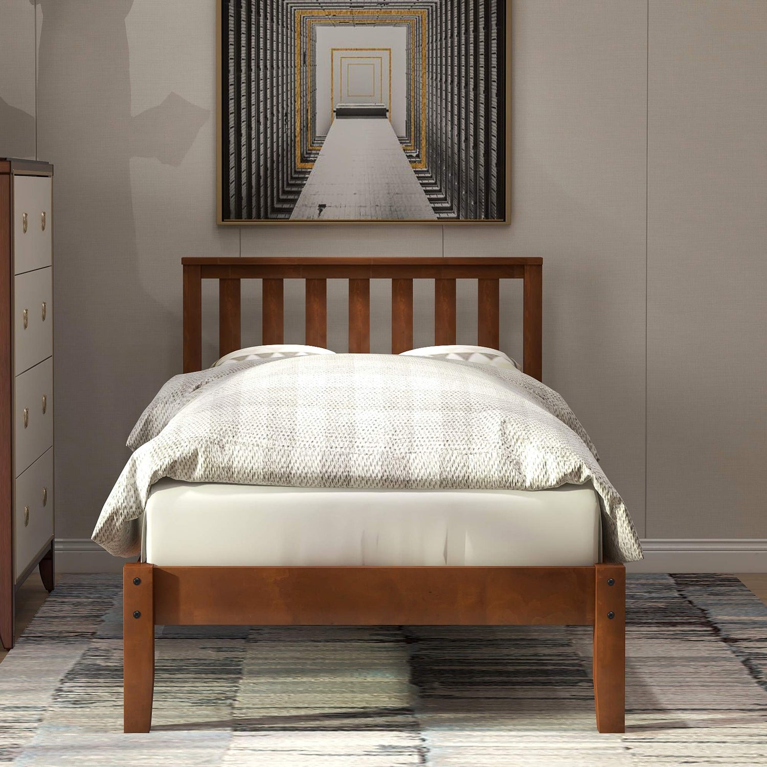 SOFTSEA Twin Platform Bed Frame with Storage, Farmhouse Bed Frame with Headboard for Kids Teens, Wood Slats, Easy Assembly, Walnut