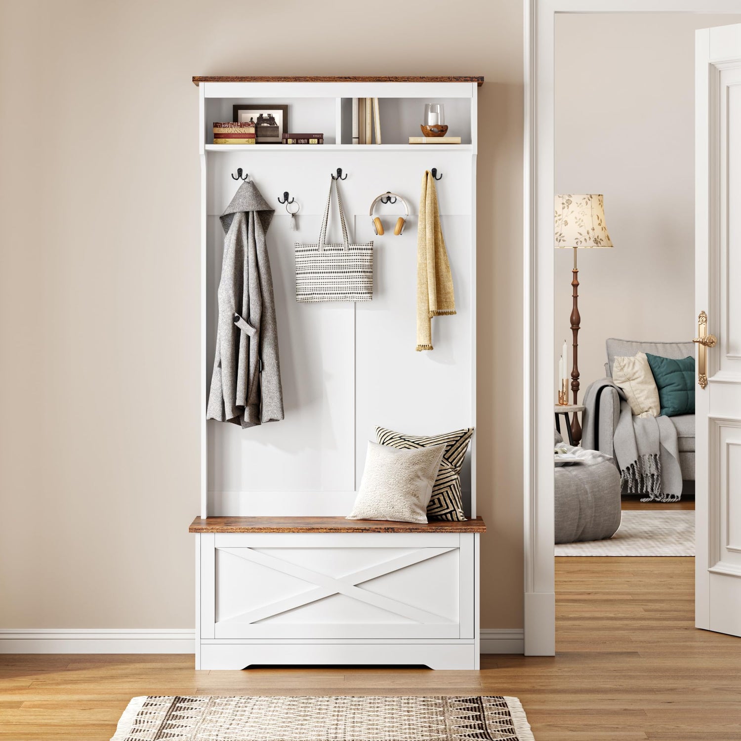 - Aesthetic Appeal with Craftsmanship: With a clean, neutral color and checker-pattern door panels, this framehouse hall tree organizer complements both modern and traditional decor. It transforms your entryway into a stylish and functional space, enhancing your daily routine and home environment