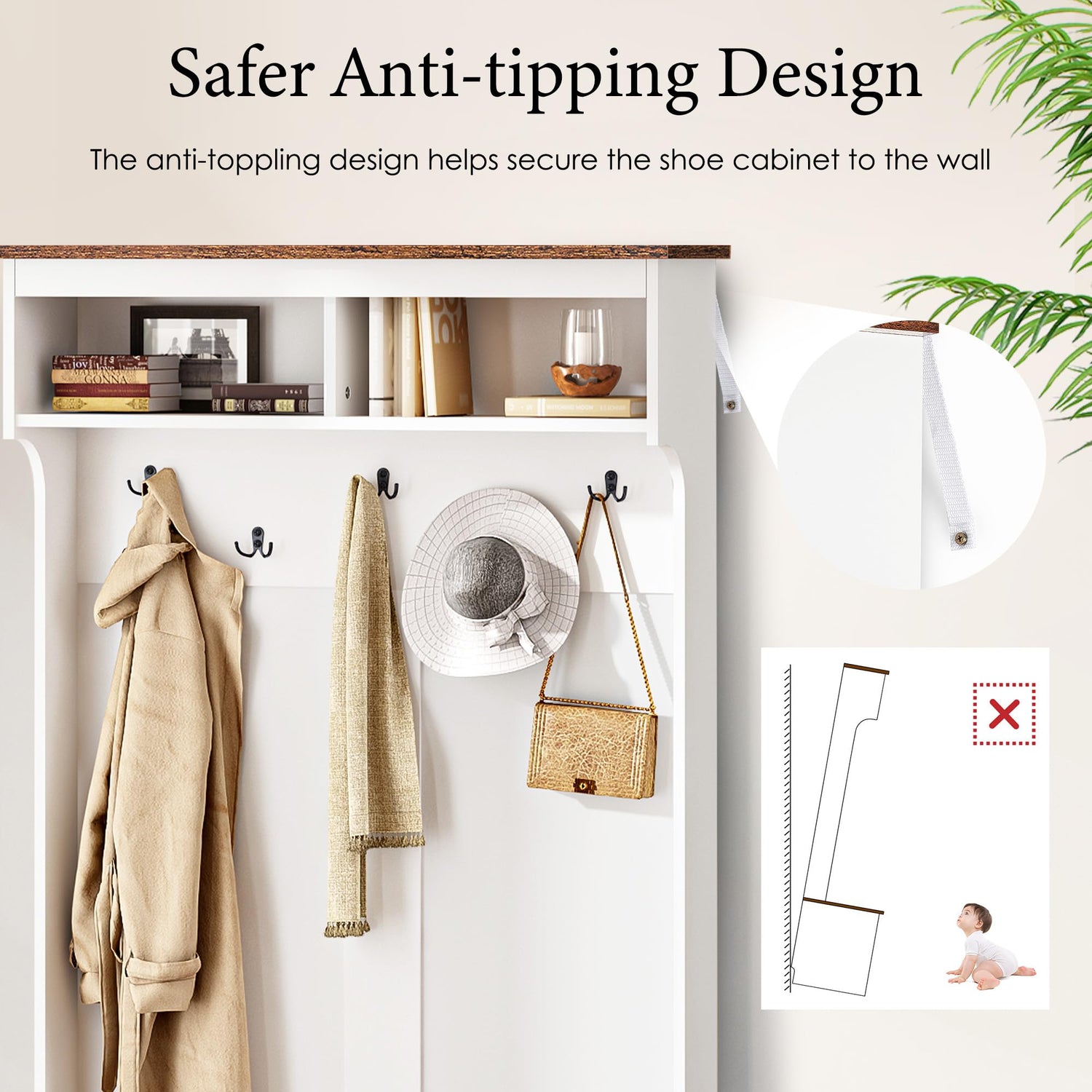 - Stability and Durability: This mudroom bench with storage and hooks constructed from durable medium-density fiberboard (MDF) and equipped with high-quality metal hinges for smooth operation. An included anti-tip kit ensures the hall tree with shoe storage stays securely, providing safety and peace of mind for your family