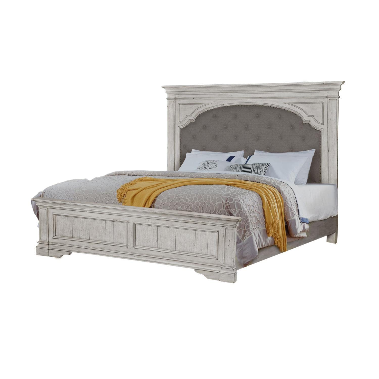 Details: Highland Park features vintage styling in a classical bedroom collection. Sturdy construction using hardwood solids and veneers in a distressed rustic ivory finish. The King Panel bed offers a tall panel headboard and low footboard highlighted by heavy crown molding and elegant pilasters. A gorgeous shaped dove grey fabric inset in the headboard features button tufting and antique brass nail head trim. Requires a mattress and boxspring - sold separately.