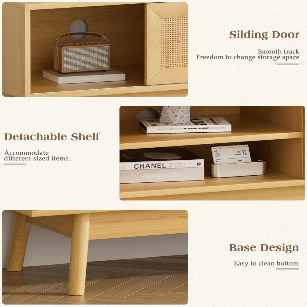 - 【MULTIFUNCTIONAL STORAGE CABINET】:Rattan TV Stand features a Bohemian style with Mid Century design, measuring 46.8*15.4*17.3in in Wood color. With 1 Doors and 2 Open Shelves, this sliding door TV cabinet offers ample space for storage, making it a perfect addition to any living room decor.