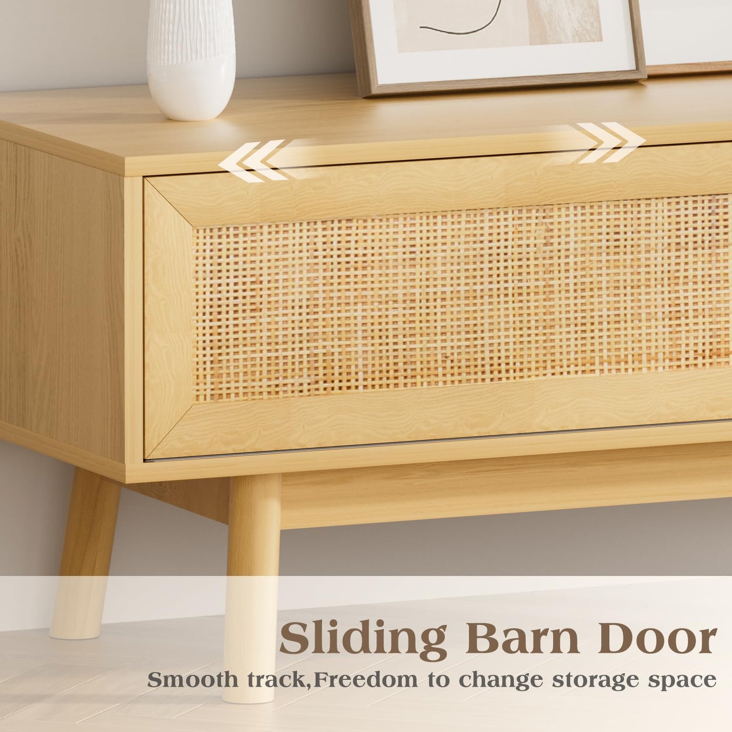 - 【SATISFACTION GUARANTEE】: Elevate the aesthetic of your living space with this modern TV console featuring a sliding door and roomy interior. The boho design of the TV stand rattan blends seamlessly with any style decor, making it a perfect choice for anyone looking for a boho TV stand console that offers both form and function.