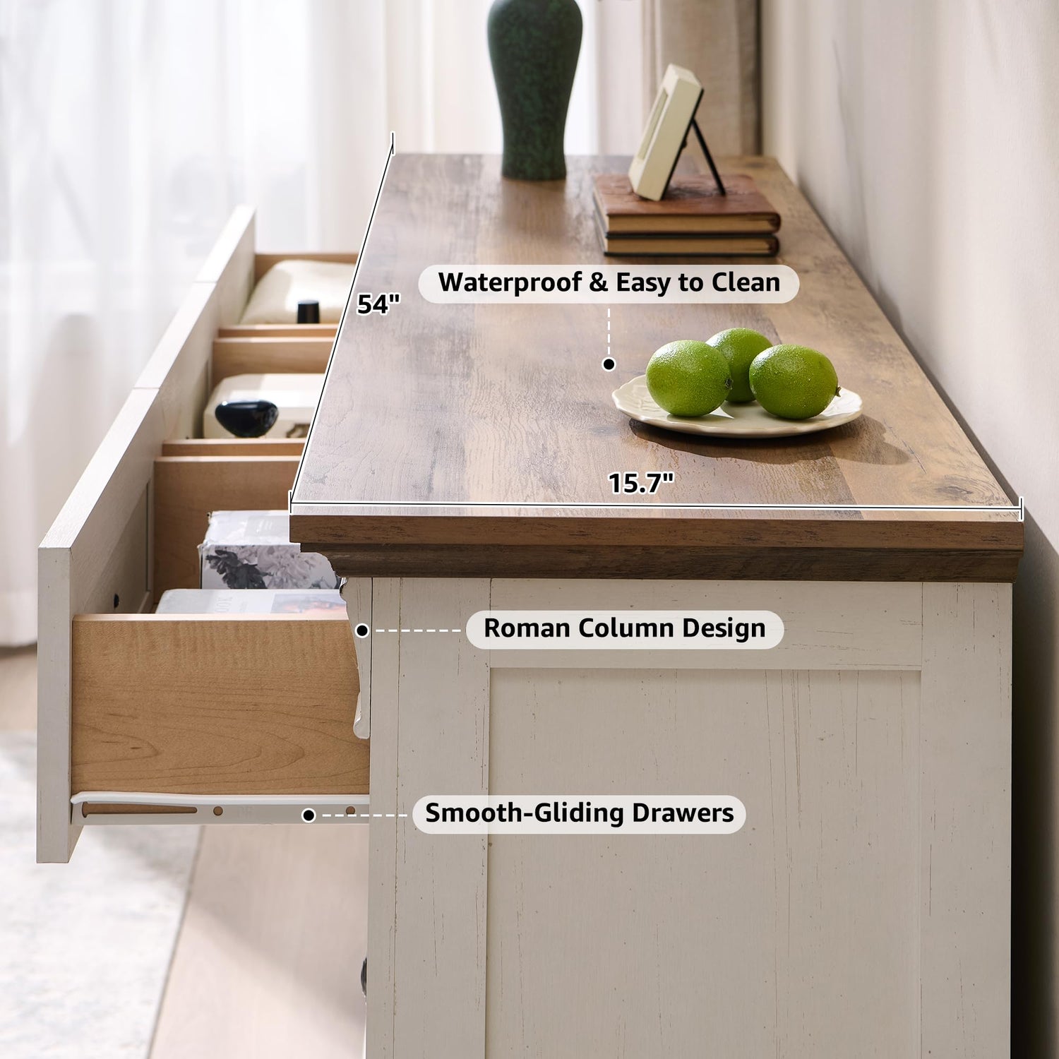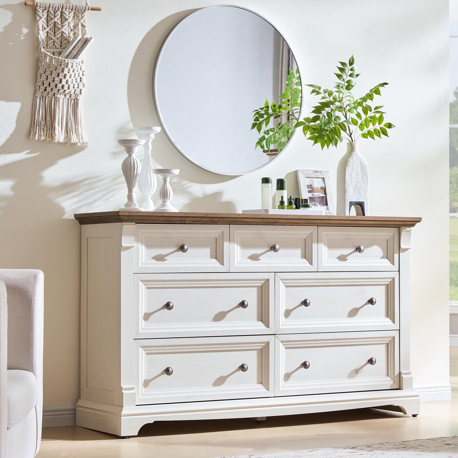 - Exceptional Storage Capacity with Smart Organization:Measuring 54"W × 15.75"D × 31.89"H, this 7 drawer dressers for bedroom features 3 small drawers for jewelry and 4 large drawers for linens. Combine two for a 14-drawer farmhouse dresser. The spacious tabletop displays photos or essentials, making these drawers for bedroom as practical as beautiful.