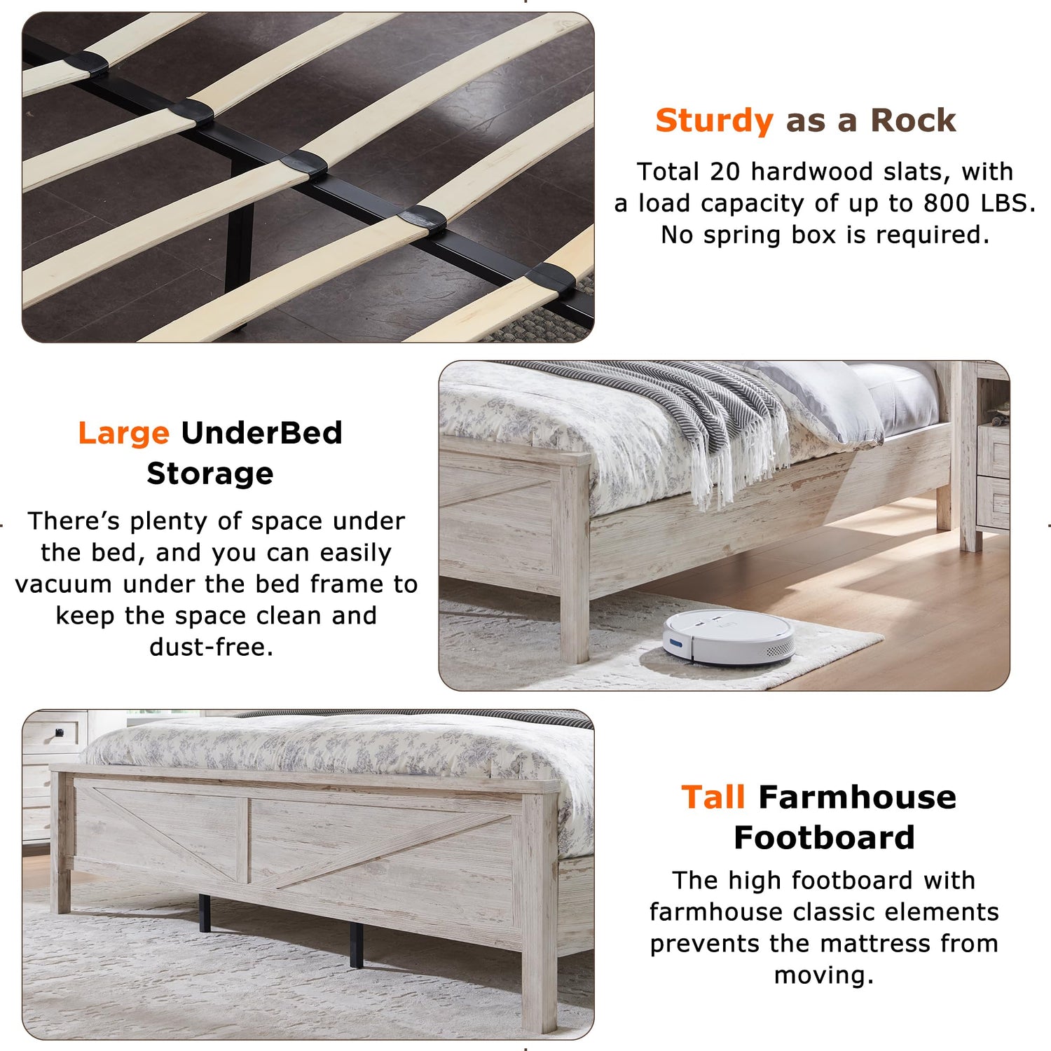 • Thoughtful Functionality: Equipped with a built-in AC/USB power outlet on the headboard and underbed storage space, this bed seamlessly integrates modern conveniences into its farmhouse aesthetic.