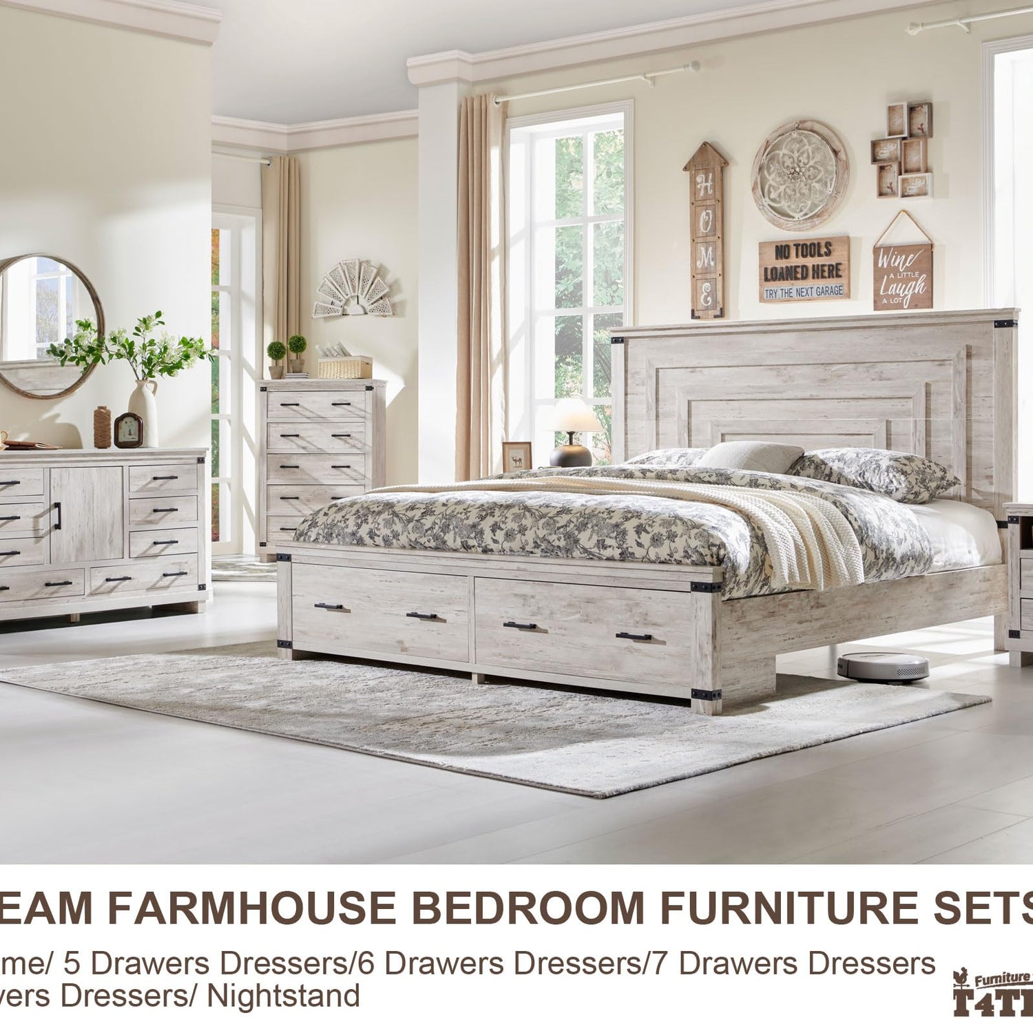T4TREAM Farmhouse King Size Bed Frame with 54" Tall Geometric Headboard & 2 Large Storage Drawers, Rustic Wood Platform Bed with Wood Slats Support, No Box Spring Needed, Antique Brushed White