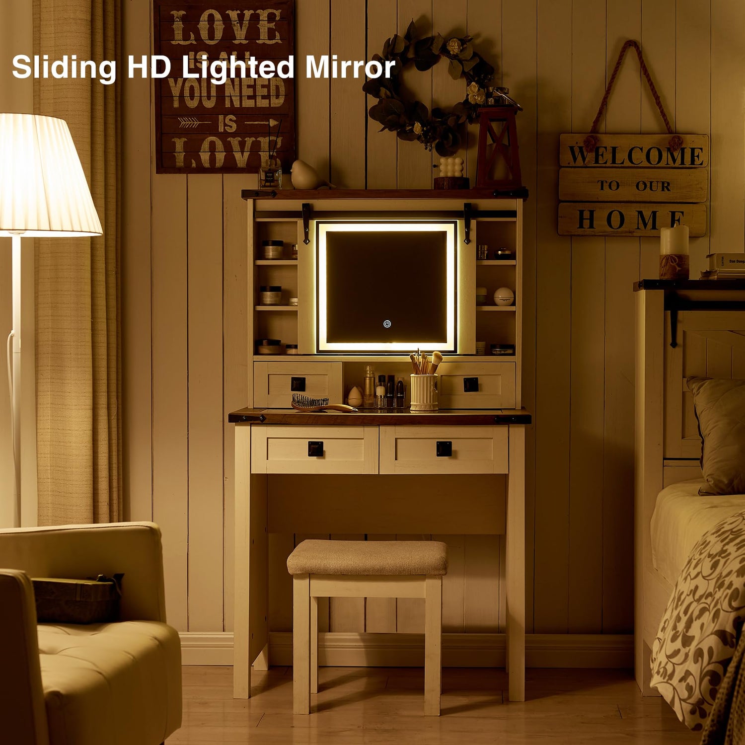 T4TREAM Farmhouse Makeup Vanity Desk with Sliding Mirror and Lights, 31.2'' Glass Tabletop White Vanity Table with 2 Drawers & Shelves, Rustic Vanity Set for Bedroom, Stool Included, Antique White