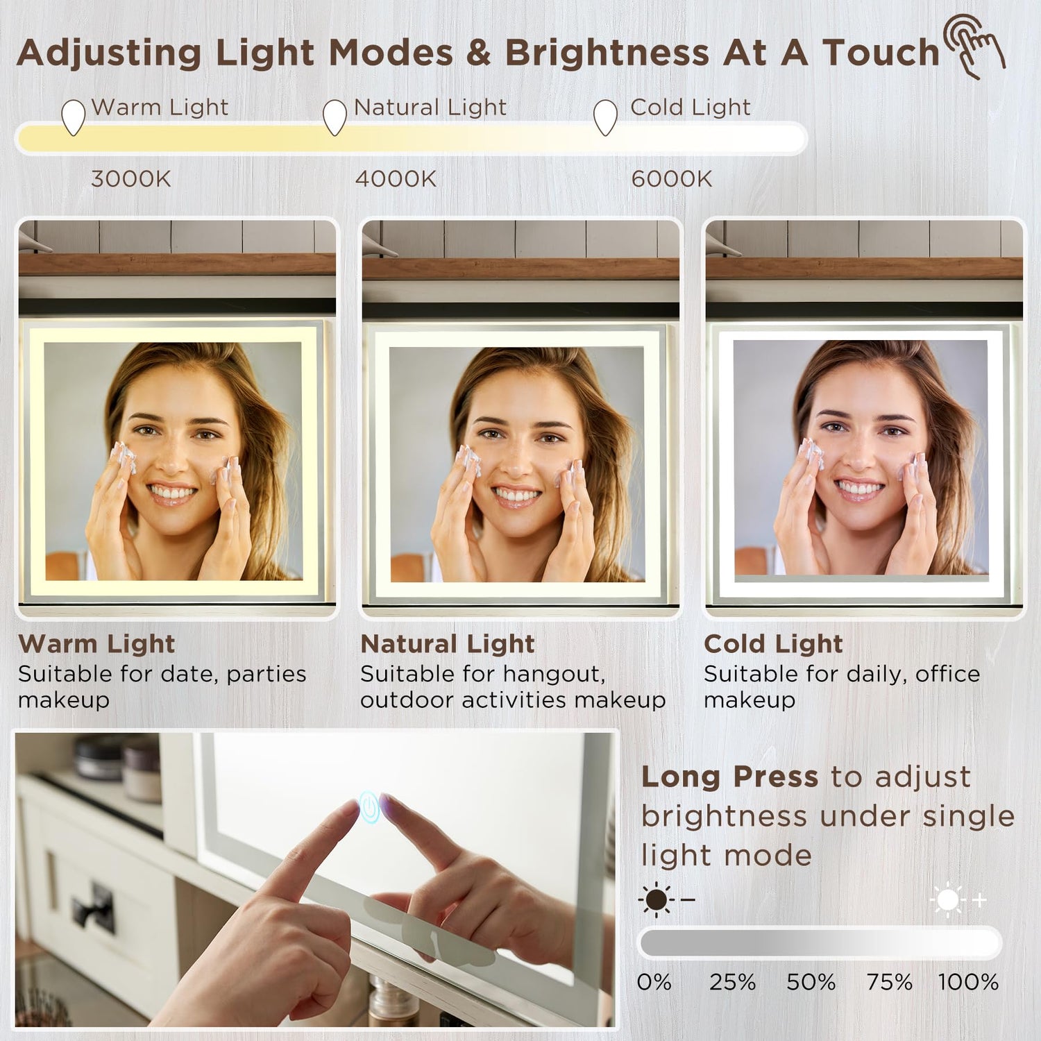 - SLIDING TOUCH CONTROL LIGHTED MIRROR: You can slide the mirror to either side you like freely. Operate the mirror with utmost ease through its intuitive touch control feature. Gently touch the button of the mirror to adjust the 3 color modes included. Long press to adjust the brightness under each light mode, providing you with the perfect ambiance for your makeup application, hair styling routine, or daily skin care. This user-friendly making your daily beauty rituals effortless and enjoyable.