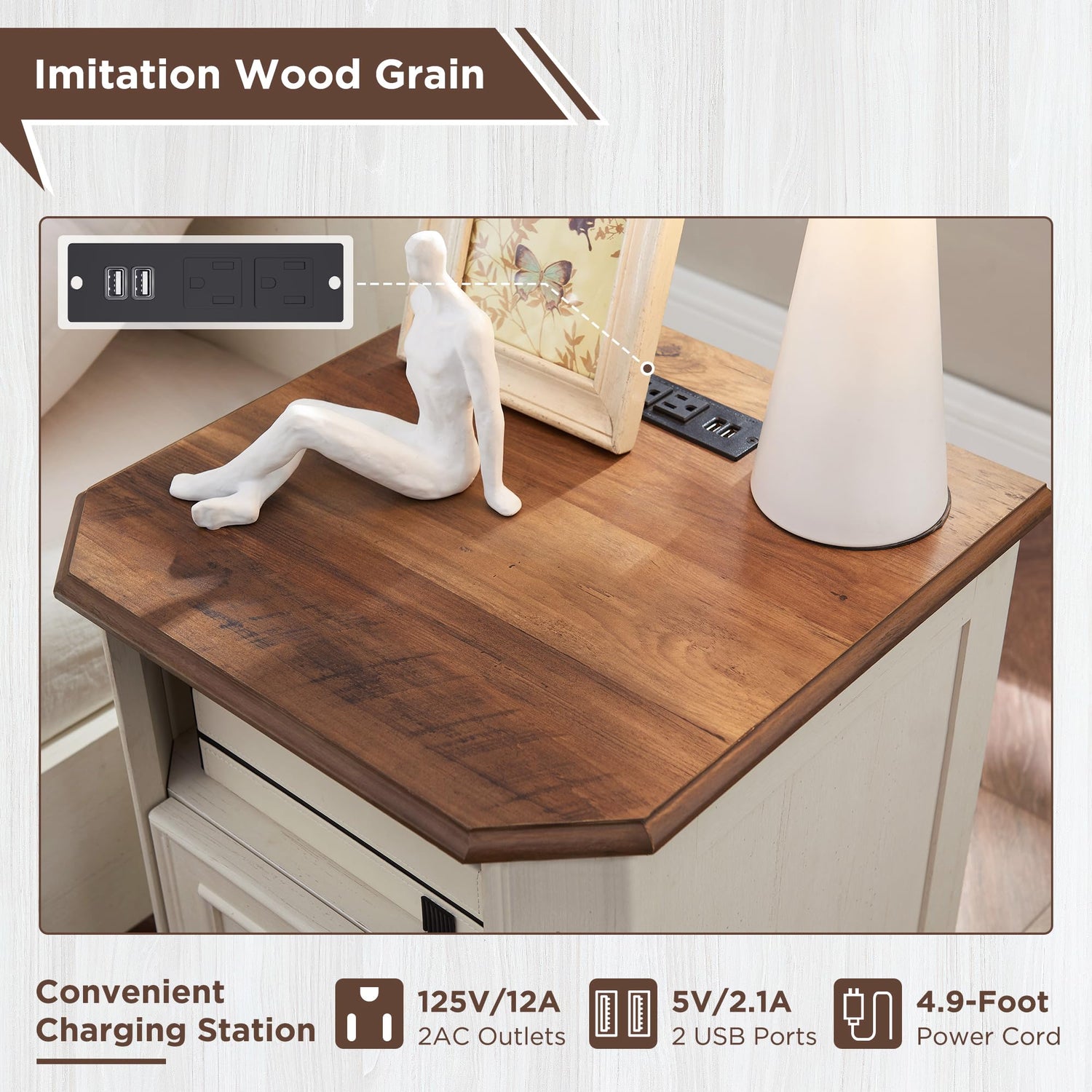 T4TREAM Farmhouse Nightstand with Charging Station, 18" End Table with 2 Drawers, Wood Side Table, Bedside Cabinet for Bedroom, Living Room (Antique White)