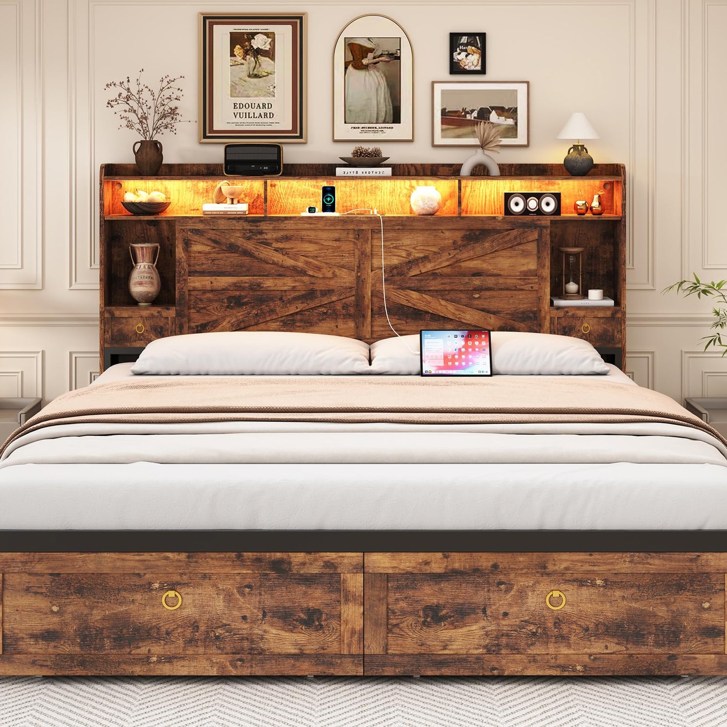 TIGUBFRE King Size Bed Frames with Storage Headboard and 4 Drawers, Farmhouse Platform Bed Frame with Charging Station & LED Lights, Metal Slats Support, Noise Free, No Box Spring Needed, Rustic Brown