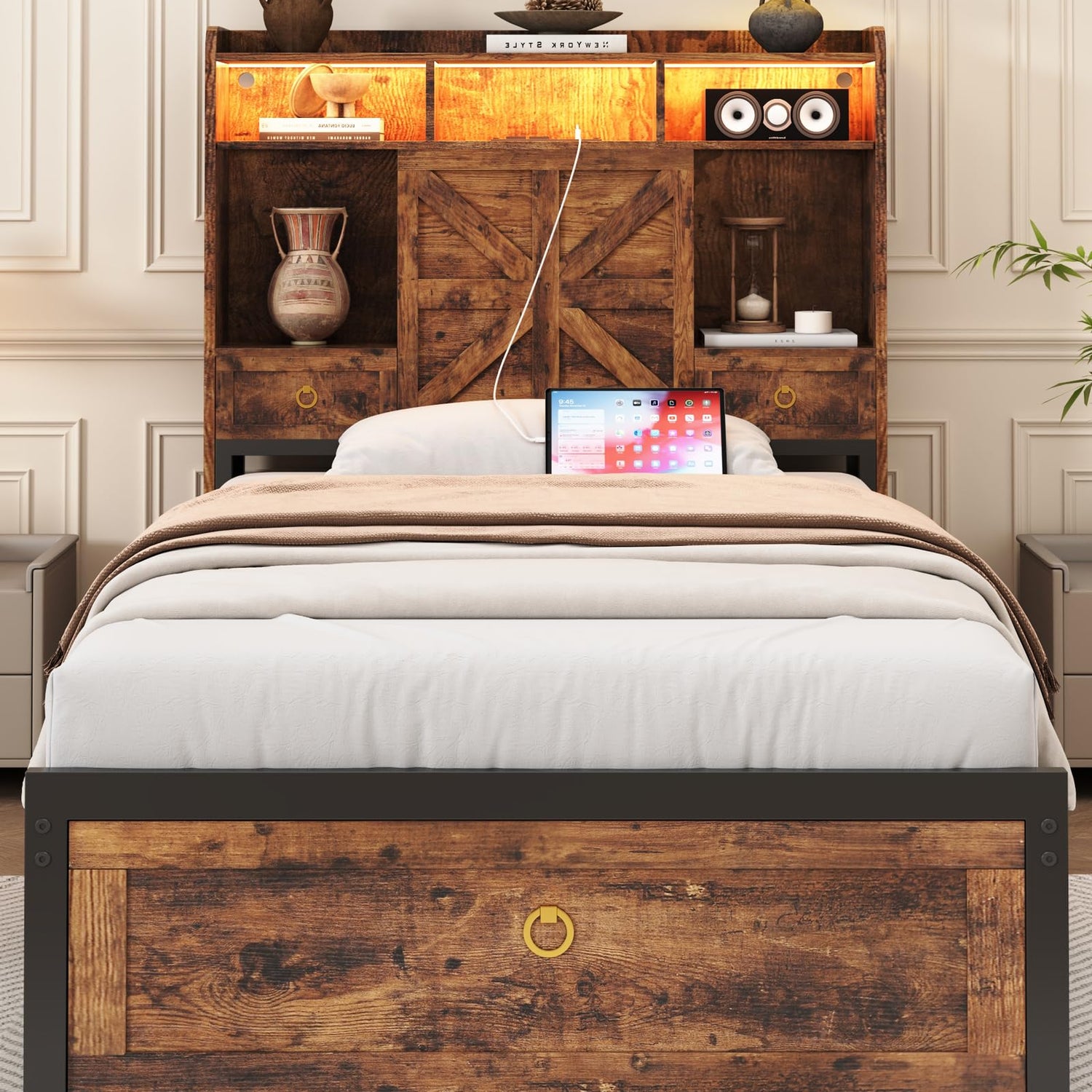 TIGUBFRE Twin Size Bed Frames with Storage Headboard and 3 Drawers, Farmhouse Platform Bed Frame with Charging Station & LED Lights, Metal Slats Support, Noise Free, No Box Spring Needed, Rustic Brown