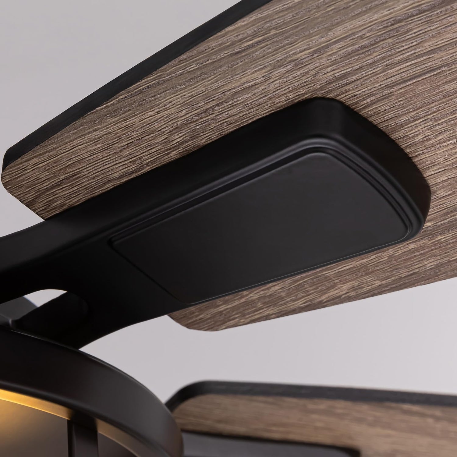 - 【Elevating Space Aesthetics】The ceiling fan showcases a chic, matte black finish with elegant reversible wooden blades, offering a harmonious blend of modern and rustic style, ideal for enhancing the decor of spaces.