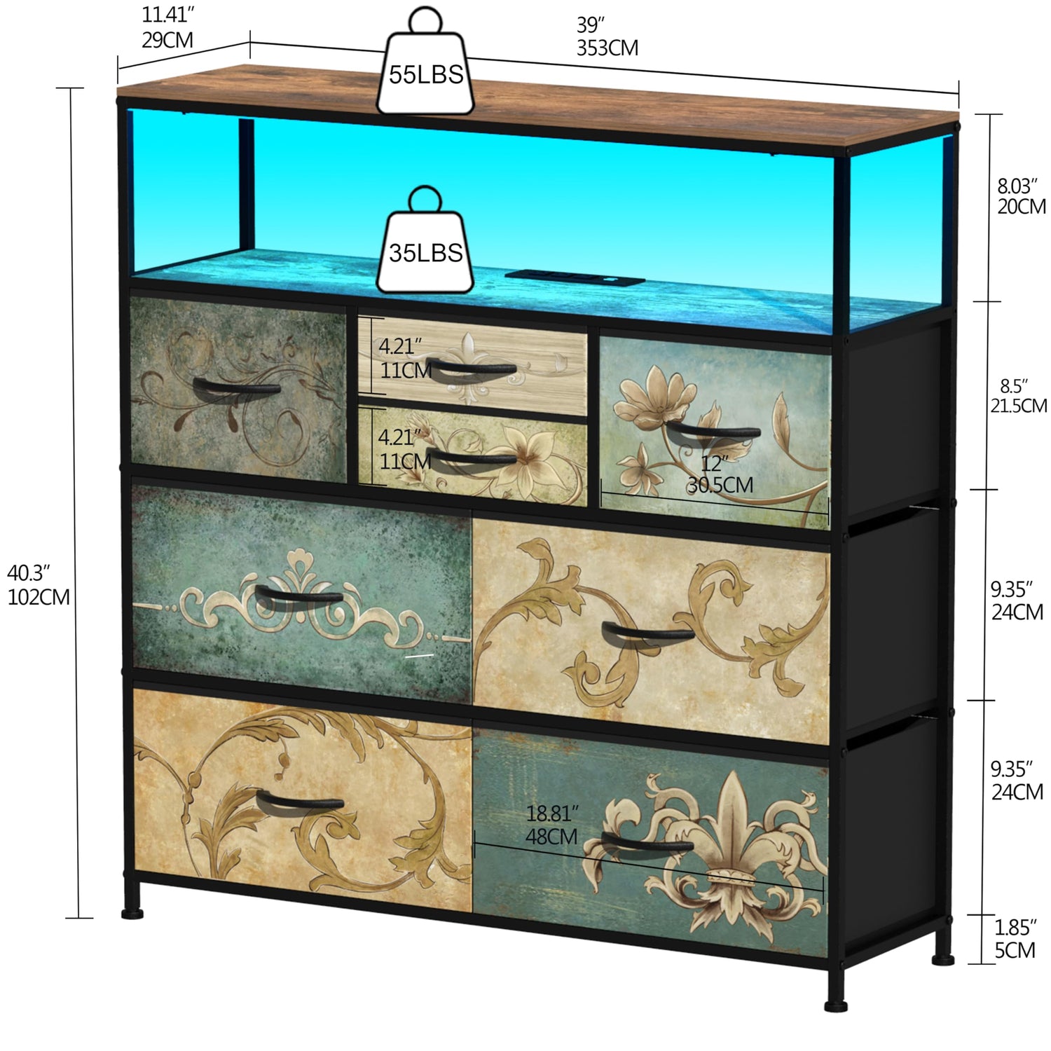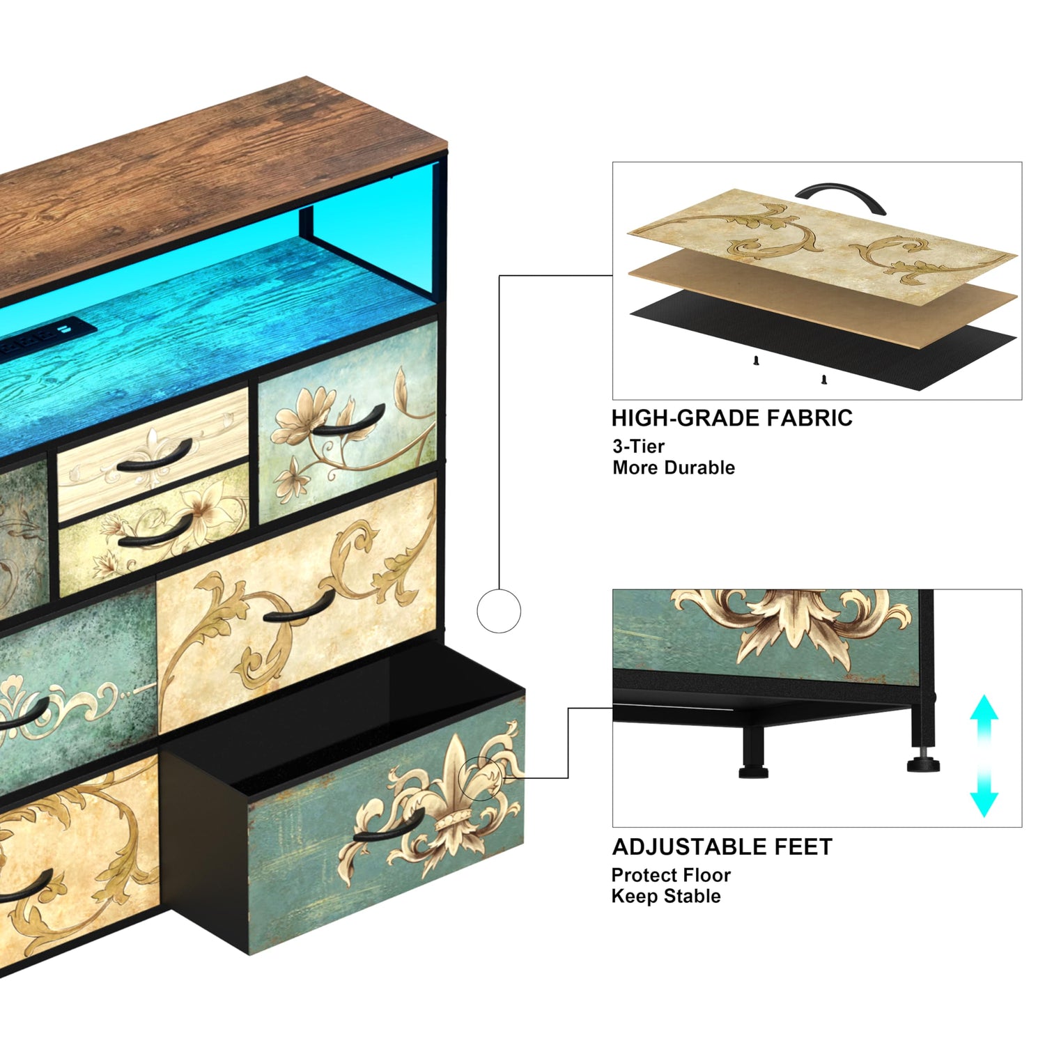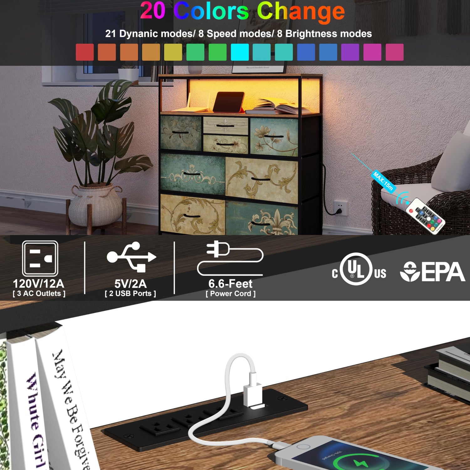 Tohomeor TV Stand with Power Oulet Dresser with Charging Station & LED Light Dresser with 8 Fabric Drawers for Living Room Storage Chest of Drawers Retro Dresser with Open Shelf Wooden Top