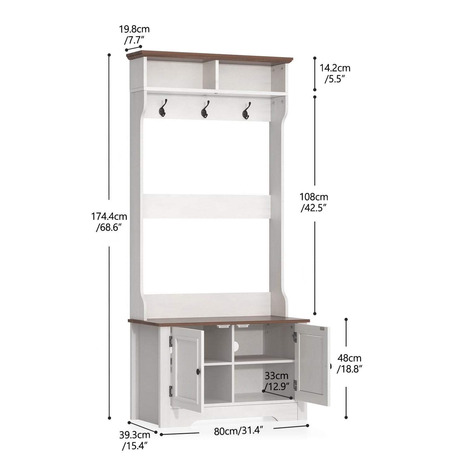 TOOBVEST Hall Tree with Shoe Storage, 5-in-1 Farmhouse Coat Rack with Shoe Bench, Standing Shoe Rack with 3 Hooks for Front Door Entrance Mudroom Entryway Bedroom Hallway Living Room, White and Walnut