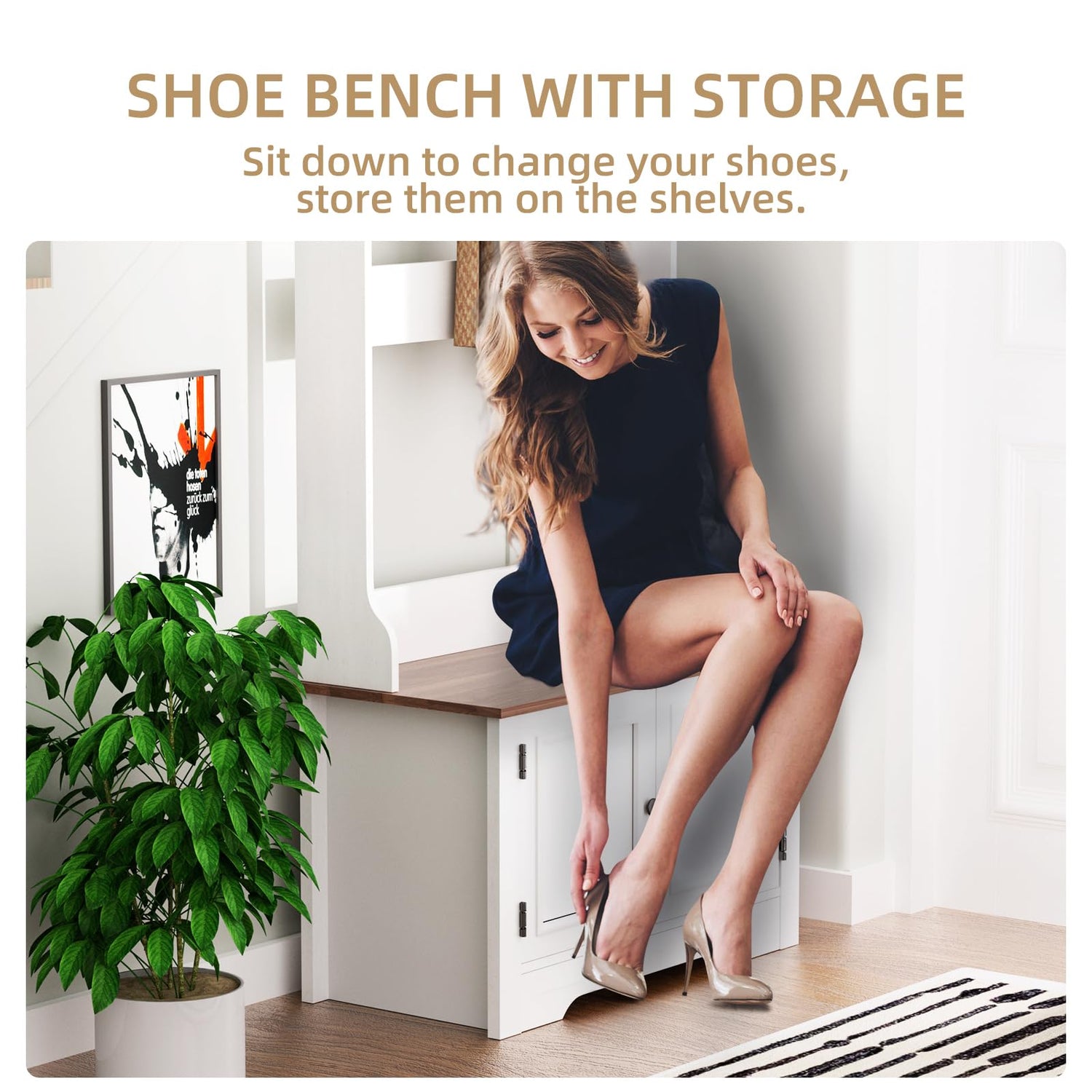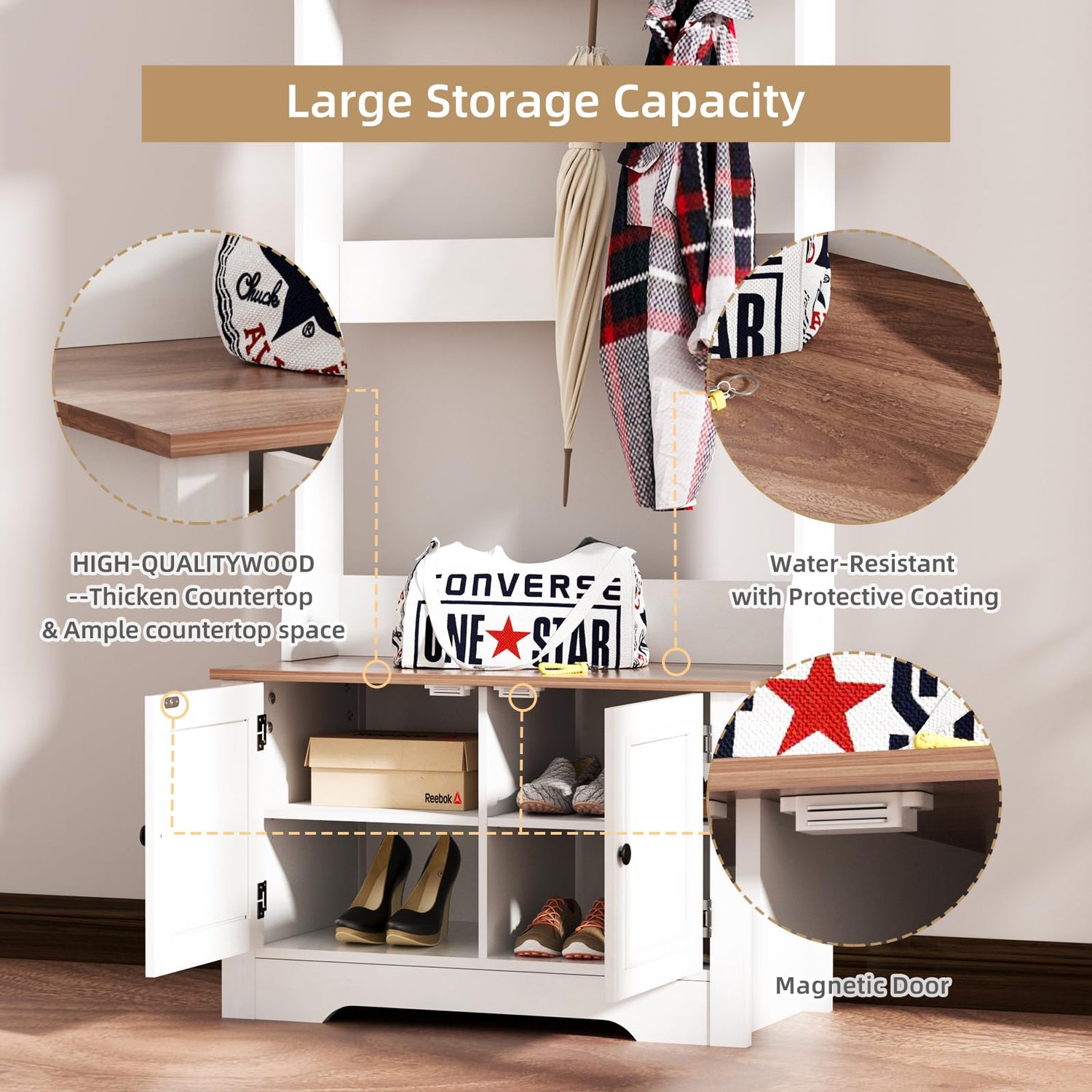 - 【Sturdy & Durable Construction】Crafted from high-quality engineered wood, this hall tree ensures lasting stability and durability for the entryway bench and its integrated white shoe rack. Built for everyday use, it offers long-term reliability, letting you change shoes comfortably while seated.