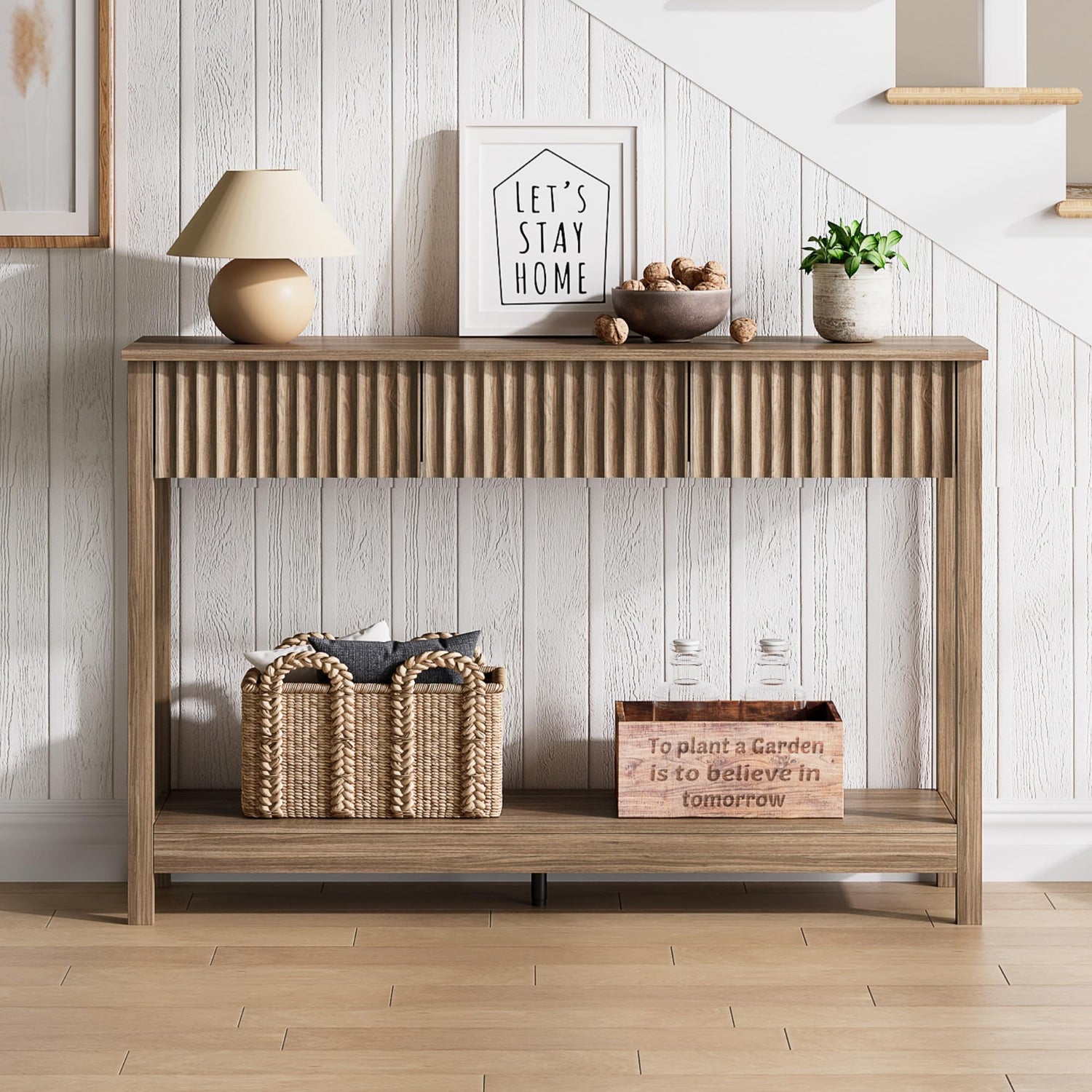 - 【Stylish Fluted Design】Farmhouse console tables with 3 drawers feature fluted detailing combined with a handleless design, creating a sleek, minimalist look. Paired with the warm woodgrain finish, the entry table delivers an aesthetic that blends effortlessly with farmhouse interiors