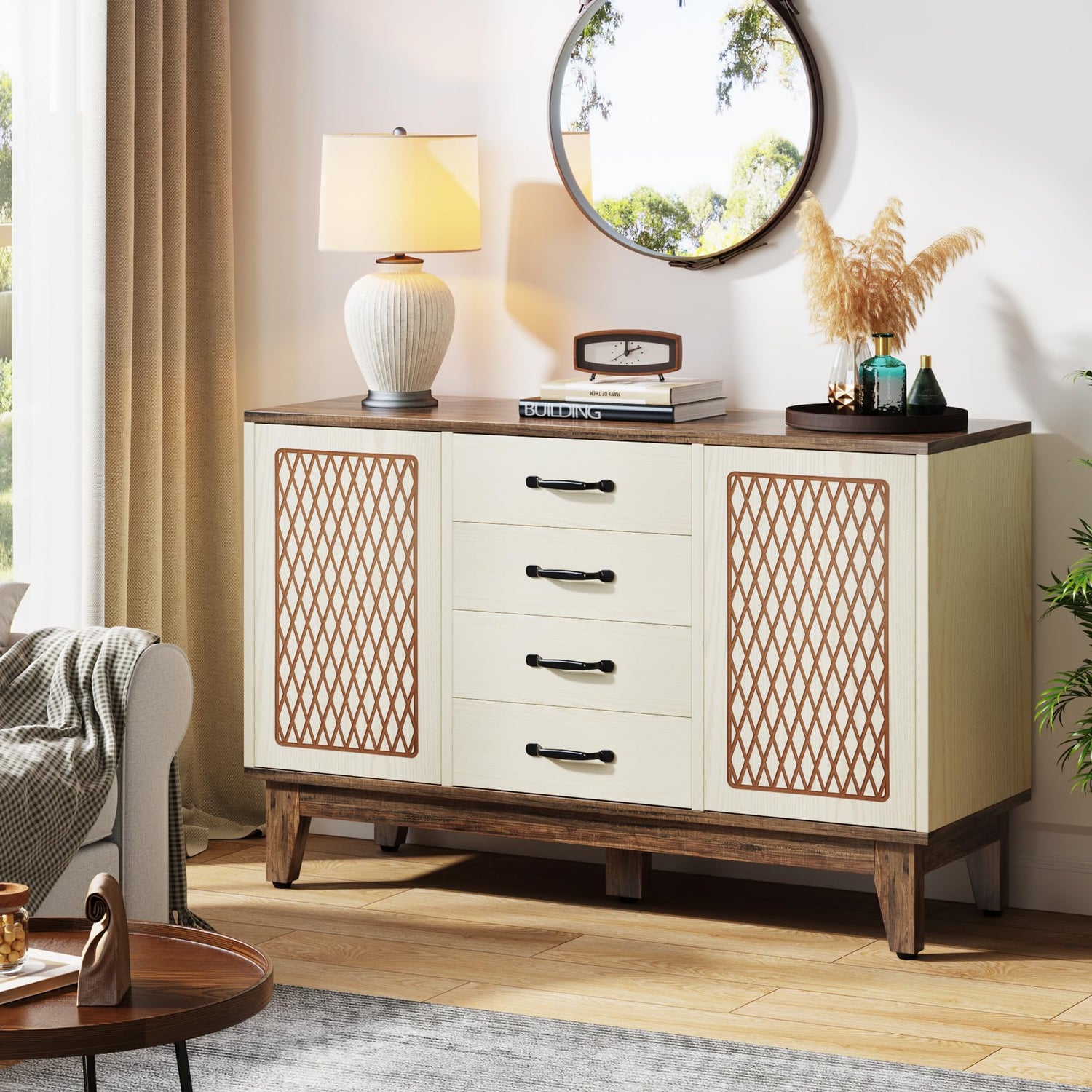 - Farmhouse Style: The brown and white finish of this dresser combines vintage elements to add character and charm to your bedroom and living room, which serves to further highlight the farmhouse style, creating an inviting and warm atmosphere in your home. NOTE: Simply press on the door and have it spring open.