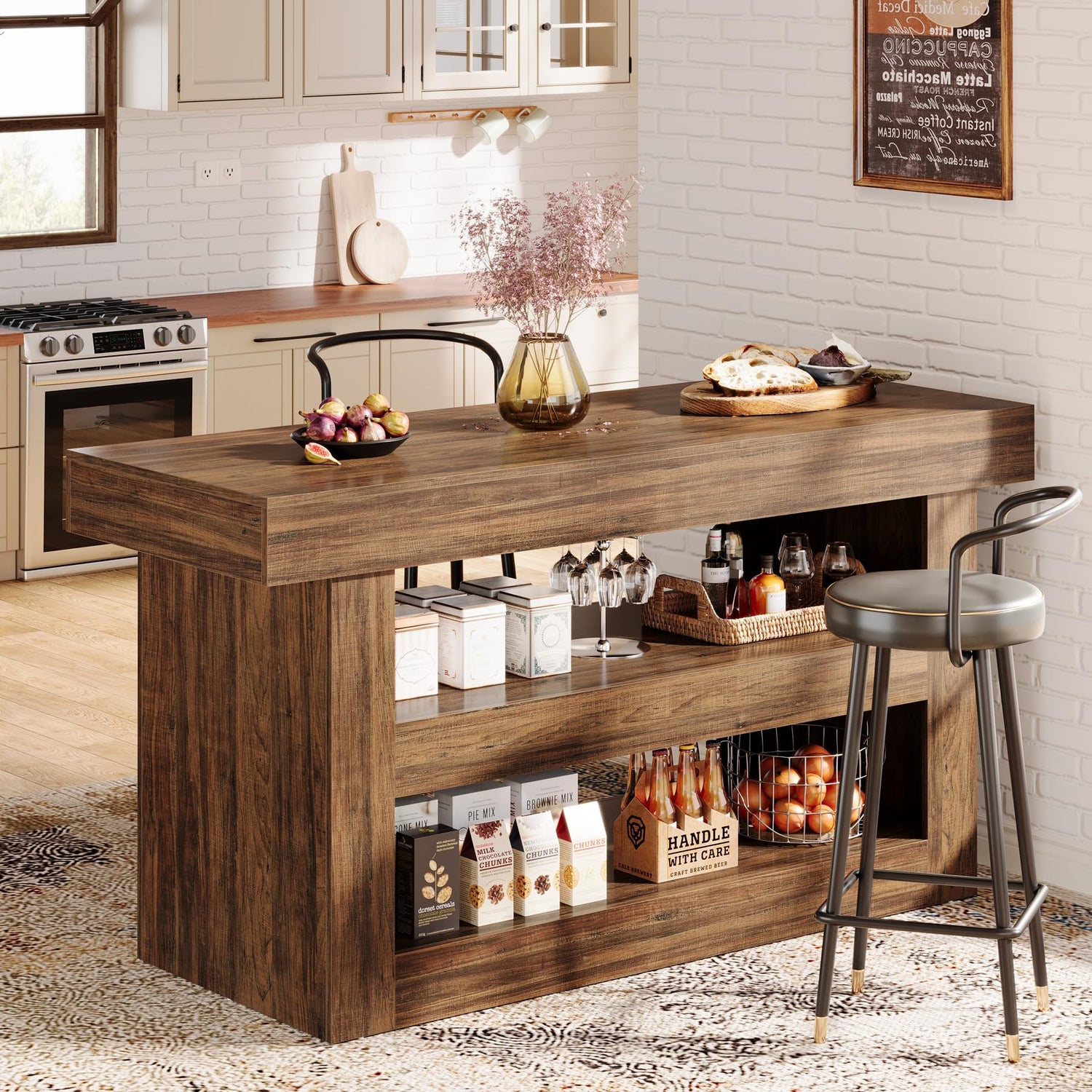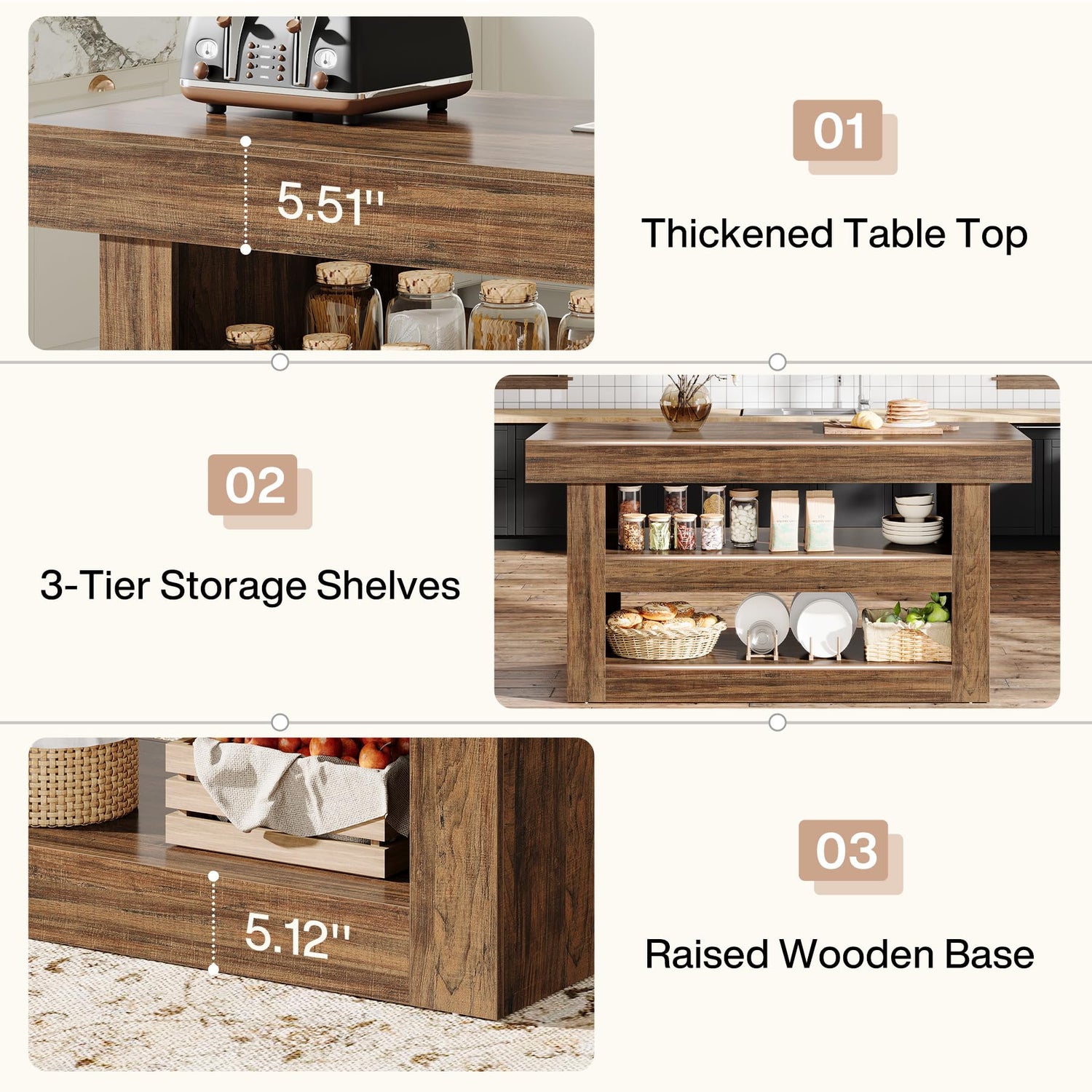 Tribesigns 55-Inch Kitchen Island with Storage, Farmhouse 3-Tier Stationary Island Table with Large Countertop, Wooden Coffee Bar Table Storage Cabinet for Kitchen, Dining Room, Living Room, Brown