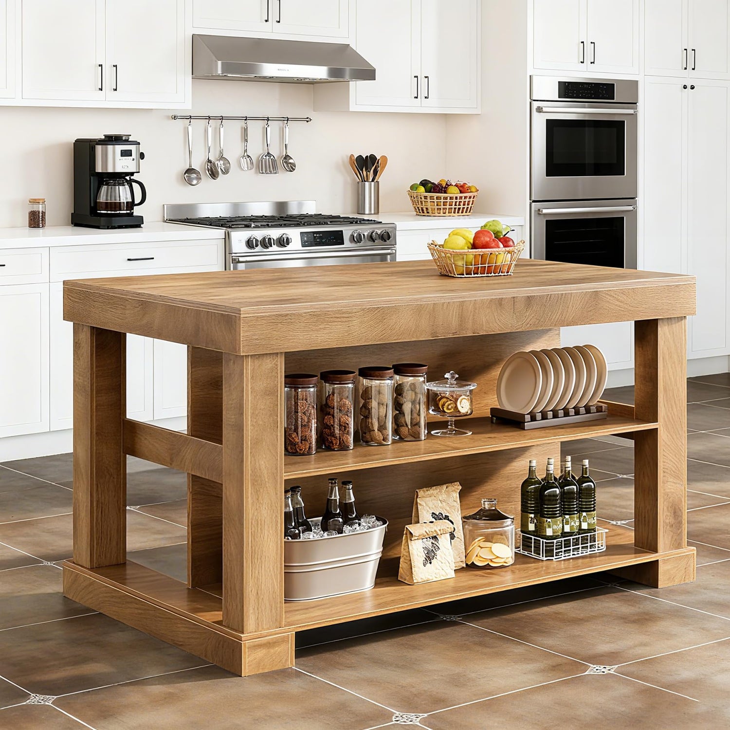 - ๐๐๐ซ๐ ๐ ๐๐จ๐ซ๐ค๐ญ๐จ๐ฉ & ๐๐ฆ๐ฉ๐ฅ๐ ๐๐ญ๐จ๐ซ๐๐ ๐: This 55-inch kitchen island features a spacious countertop for meal prep and gatherings, plus 2 open lower shelves keep dishes, cookware, and pantry items organized and within easy reach, reducing clutter