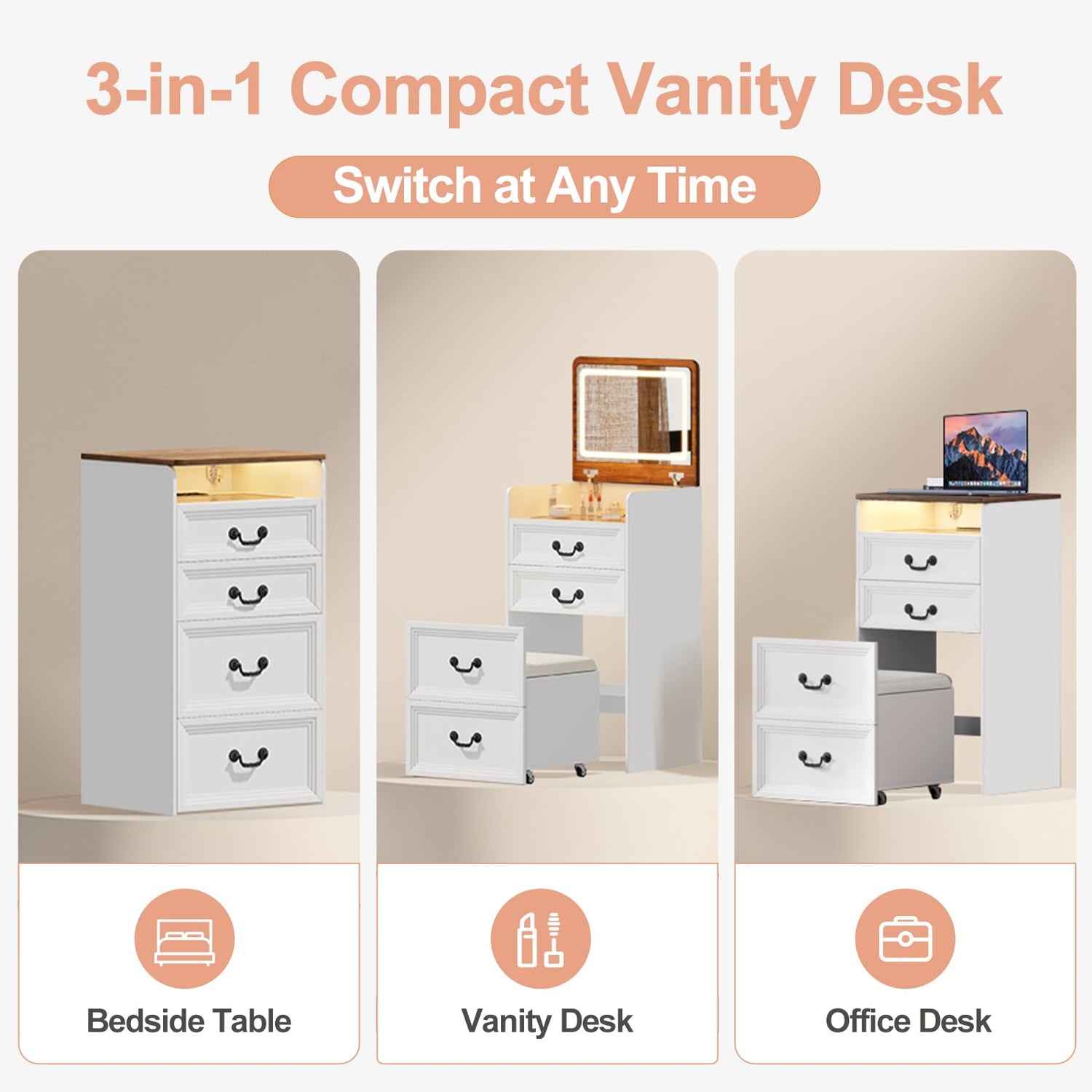 Details: Trygoal 3 in 1 Compact Vanity, Small Dresser Desk with Flip-Top Mirror & Hidden Stool, Farmhouse Vanity Desk with USB Charging Station & 3-Color Lighting, Nightstand with Visible Glass Desktop, White