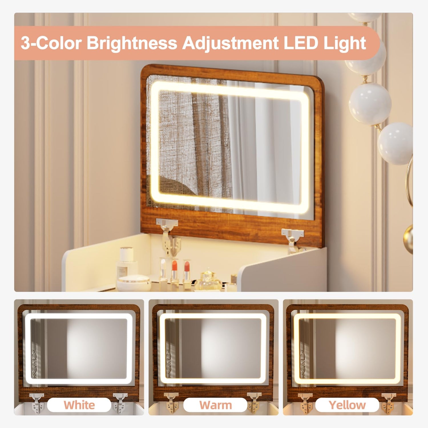 - 3-Color Dimmable Lighting: Featuring 3-color dimmable lighting with adjustable brightness, this vanity provides optimal illumination for flawless makeup application, precise grooming, and more—ensuring you always have the perfect lighting for any beauty routine.