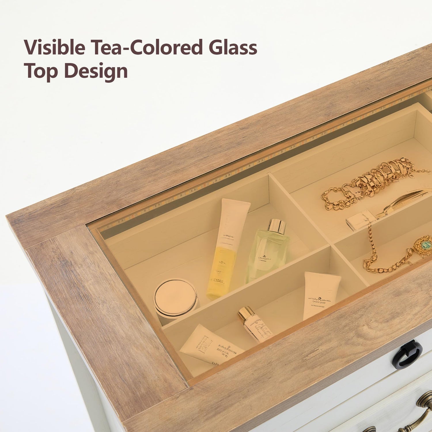 - 【Farmhouse Style & Versatile Design】 This white dresser for bedroom spaces boasts an American retro distressed finish with a creamy white cabinet and brown visible glass countertop, perfect for farmhouse dressers for bedroom decor. It blends vintage charm with modern freshness, adapting seamlessly to American, country, or light luxury home styles