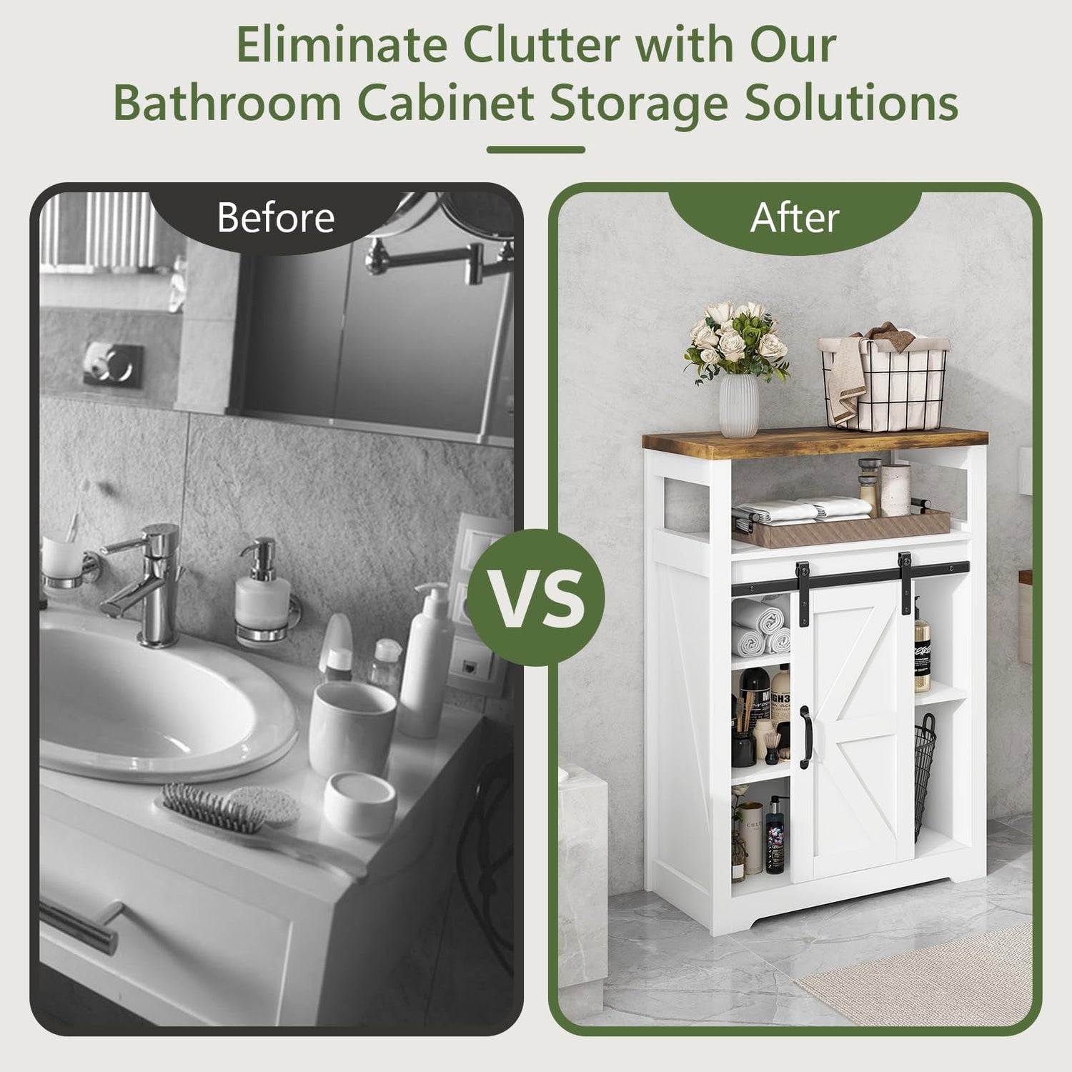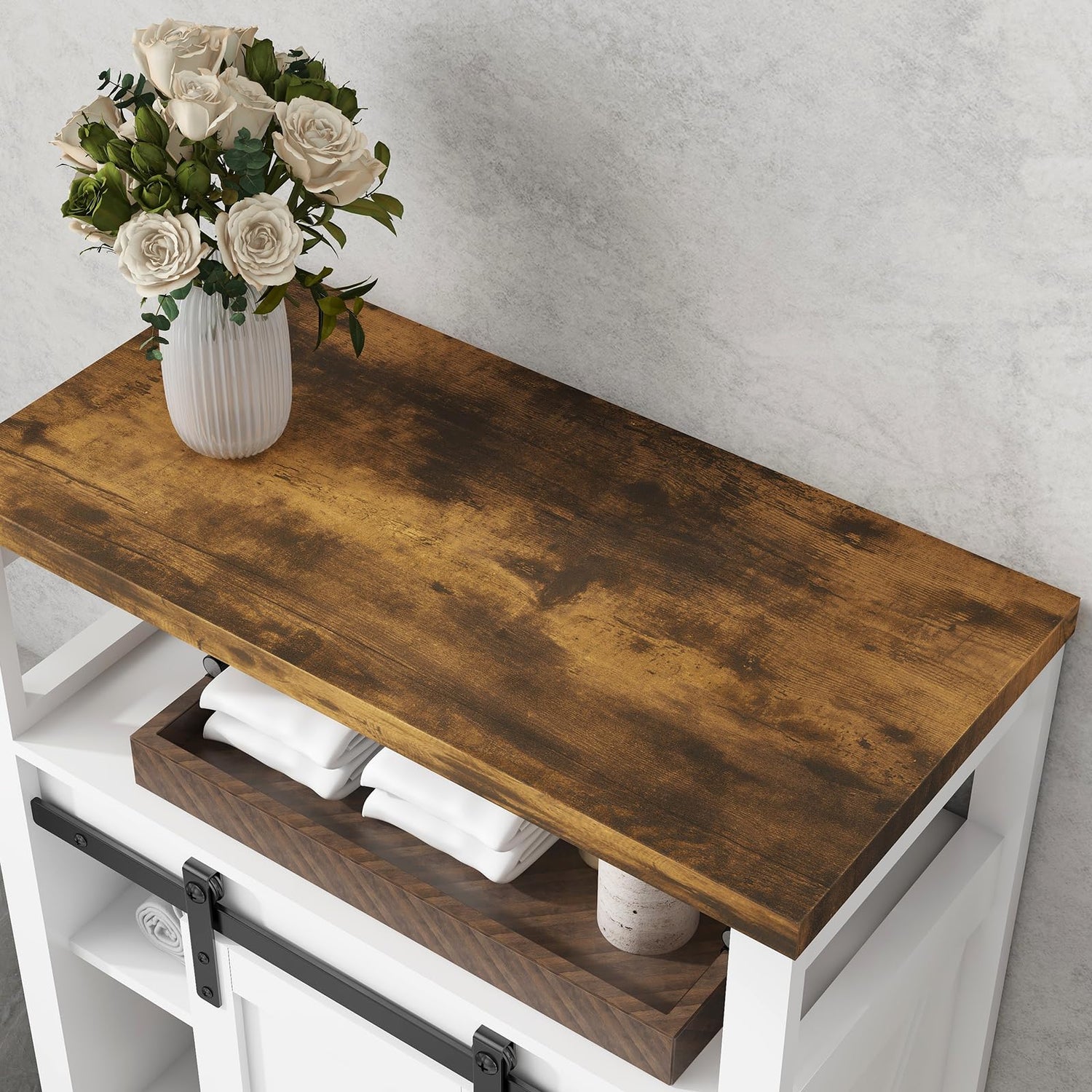 Vabches Bathroom Floor Cabinet, Small Storage Cabinet with Sliding Door, Adjustable Shelf, Farmhouse Storage Cabinet for Bathroom, Kitchen, Living Room, Rustic Style Cabinet, White