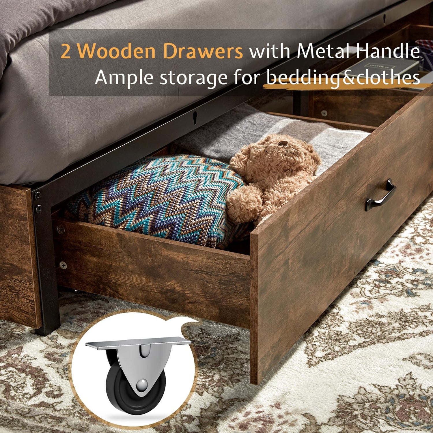VanAcc Full Size Bed Frame, Wooden Platform Storage Bed with 51.2" Bookcase Headboard, 2 Drawers, Charging Station/No Box Spring Needed/Noise Free(Rustic Brown)