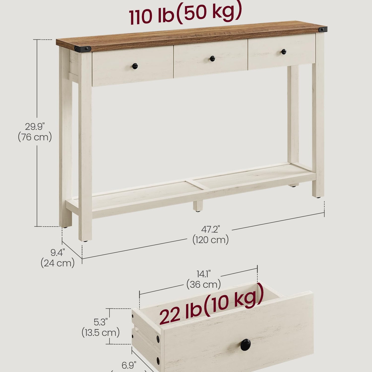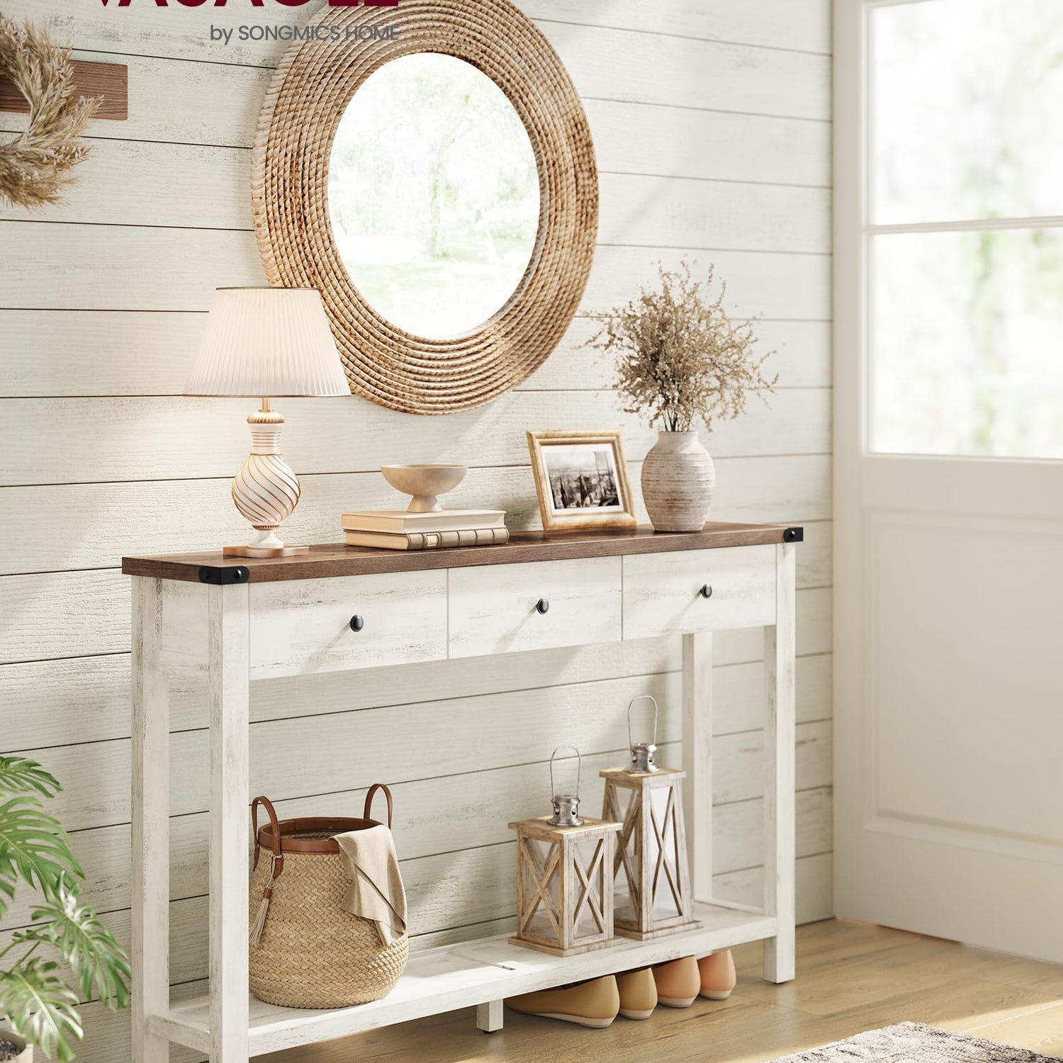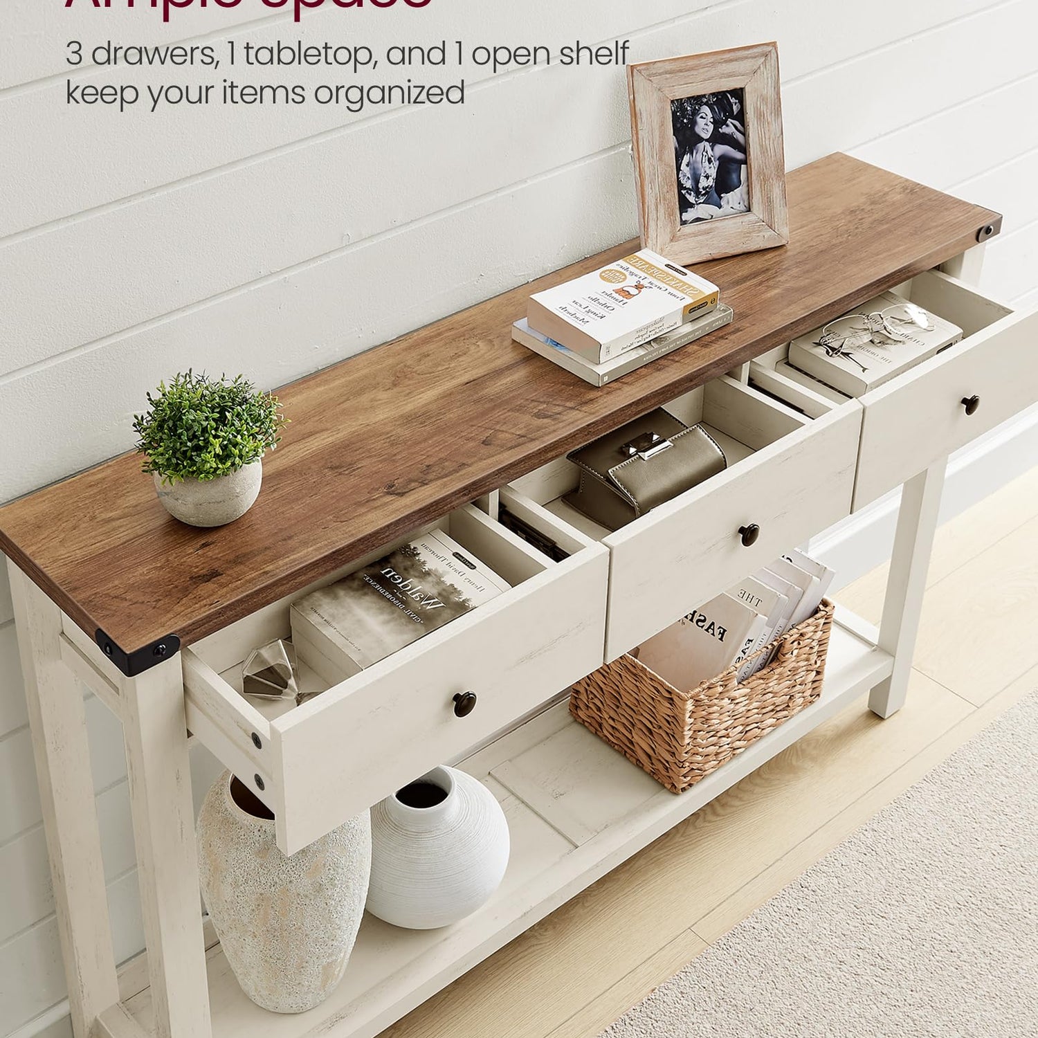 VASAGLE Console Table, Sofa Table, Narrow Entryway Table, Entry Table with 3 Drawers, Open Storage Shelf, Metal Corners, for Living Room, Farmhouse Style, Honey Brown and Rustic White ULNT142WJ02S