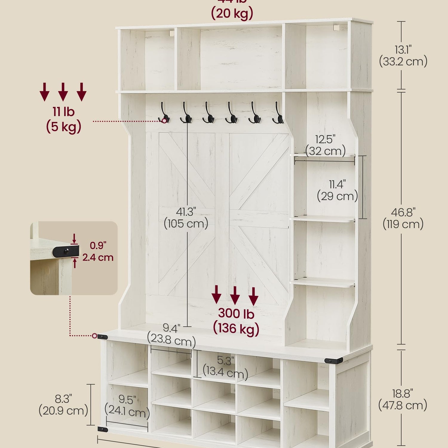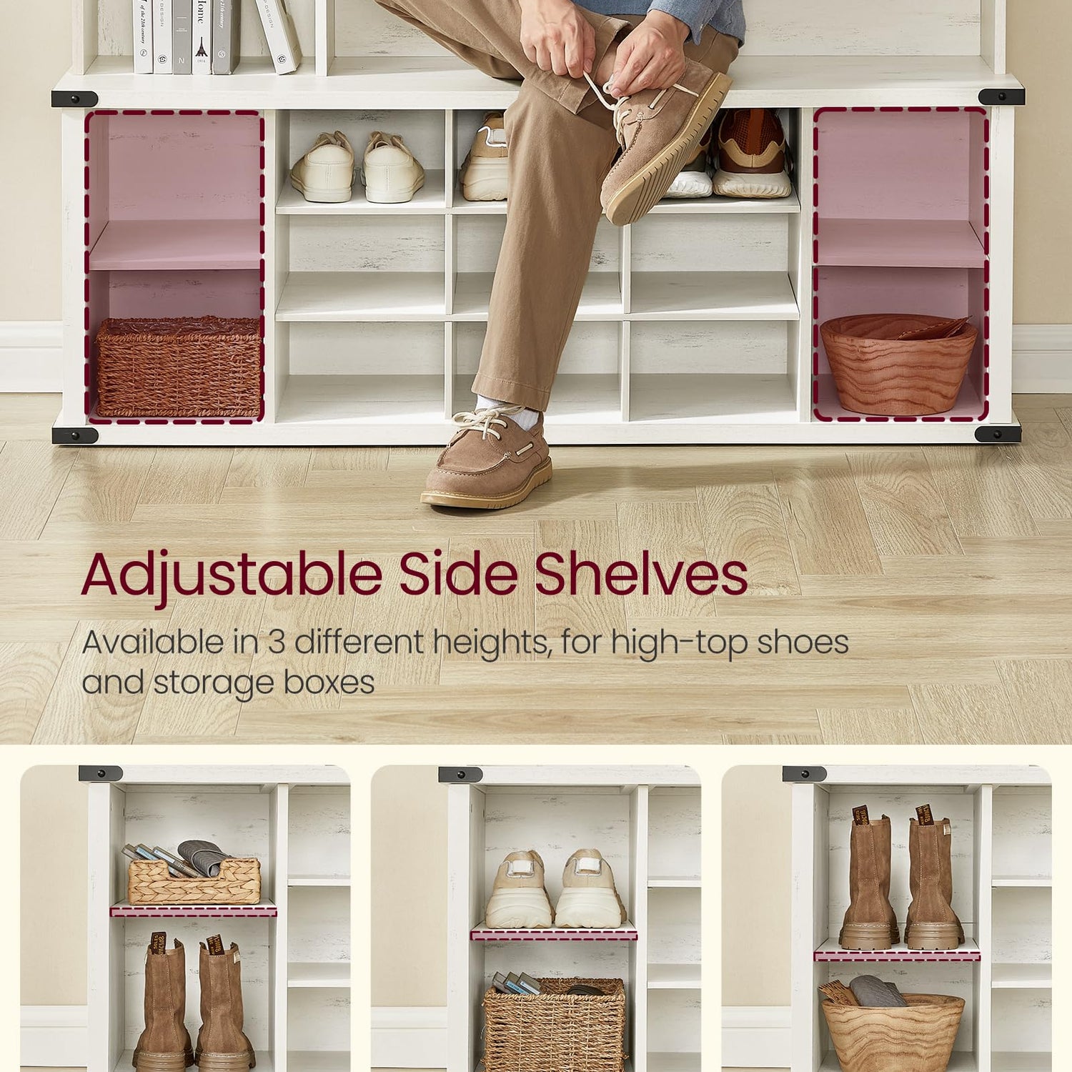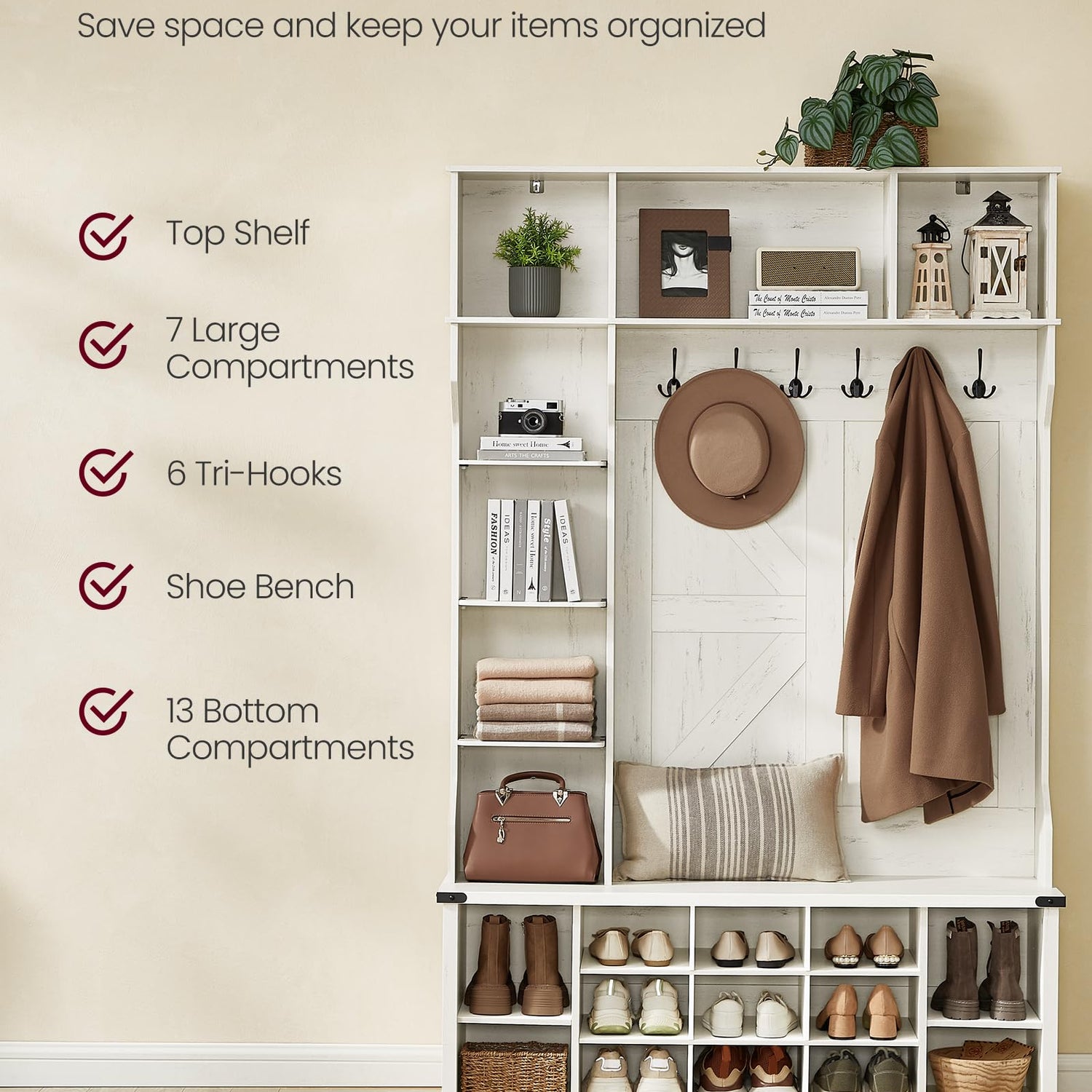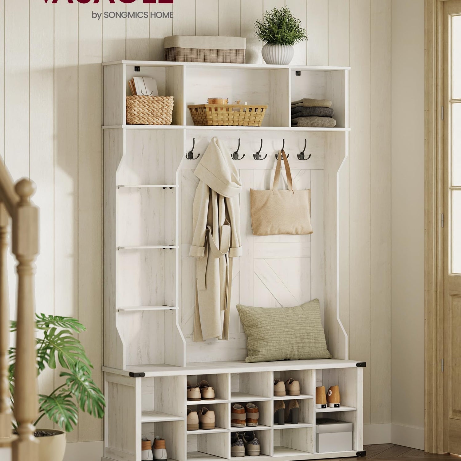 VASAGLE Hall Tree with Bench and Shoe Storage, Coat Rack with Shoe Bench, Entryway Furniture, 20 Open Compartments, 6 Tri-Hooks, Farmfouse Style, Space Saving, Rustic White UHSR440W01